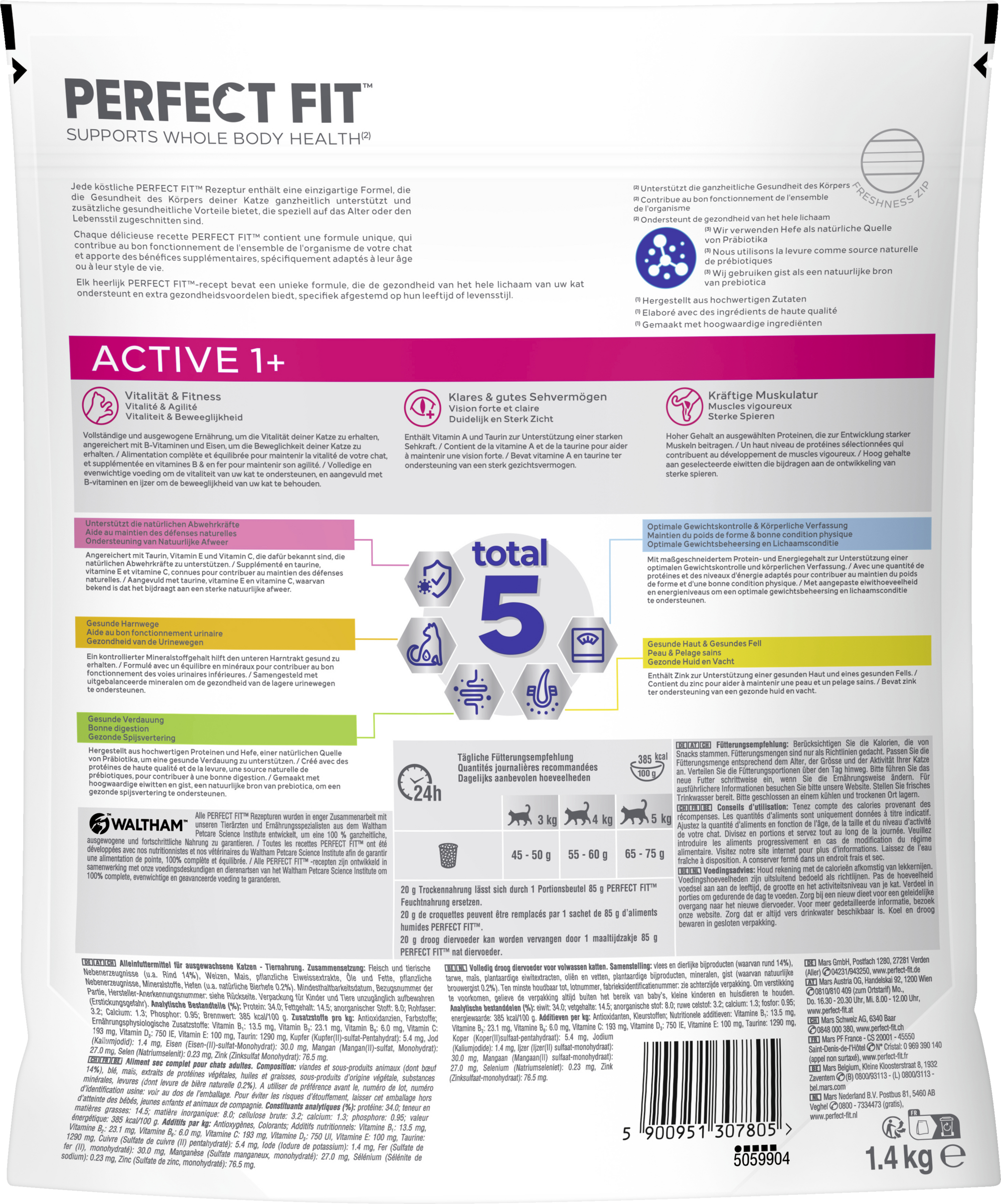 - die PERFECT FIT™ Total-5-Formel bietet fünffachen Rundumschutz: Gesunde Verdauung, unterstützt die natürlichen Abwehrkräfte, gesunde Harnwege, optimale Gewichtskontrolle & körperliche Verfassung, gesunde Haut & gesundes Fell