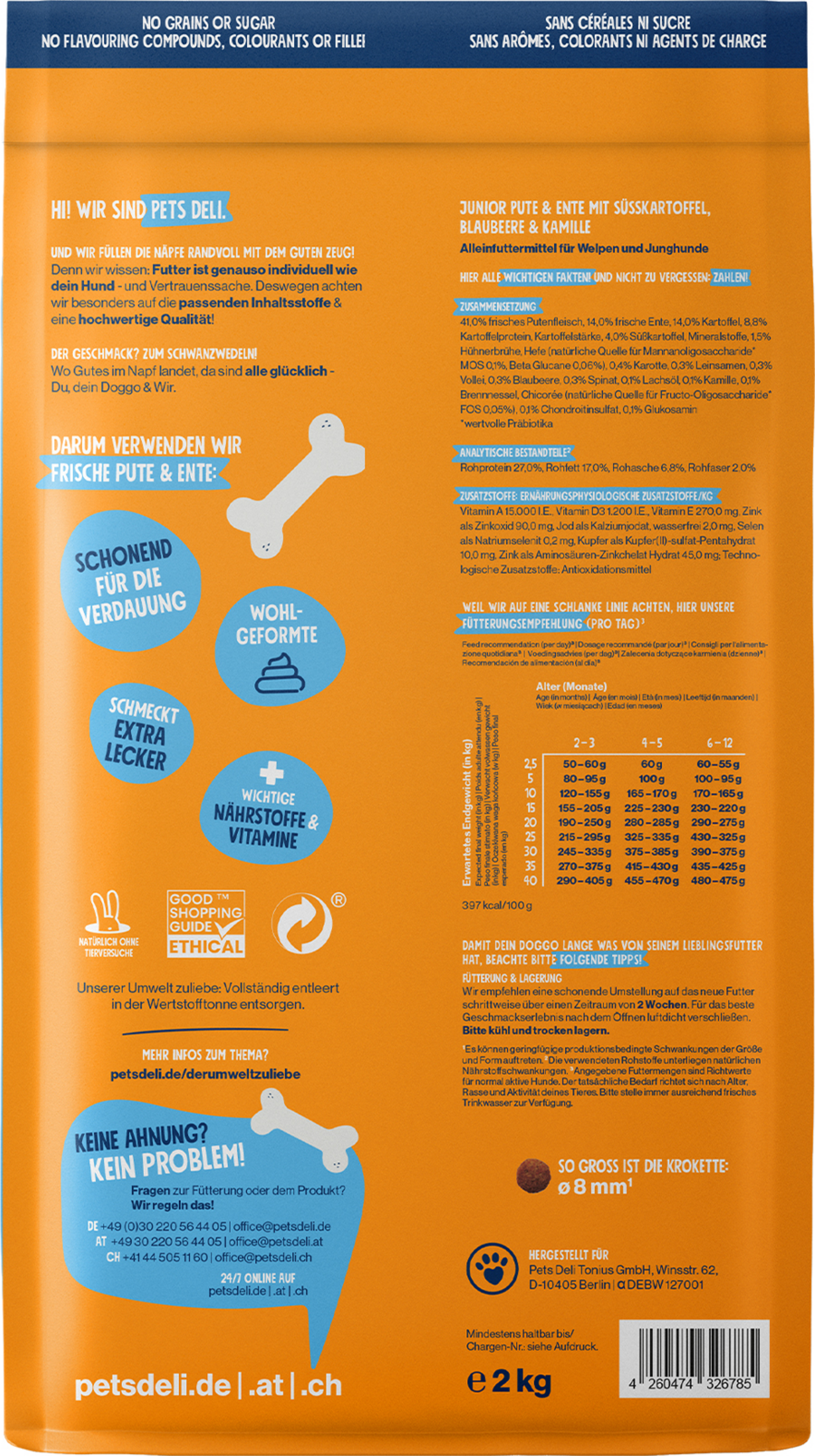 Um das schnelle Wachstum ihres Doggos bestmöglich zu unterstützen, ist die Wahl eines Juniorfutters in jedem Fall erforderlich. Das knackige Trockenfutter Pute und Ente mit mit Süßkartoffel, Blaubeere & Kamille von Pets Deli ist optimal auf die Bedürfnisse junger Hunde abgestimmt und macht jede Mahlzeit zu einem ganz besonderen Leckerbissen.