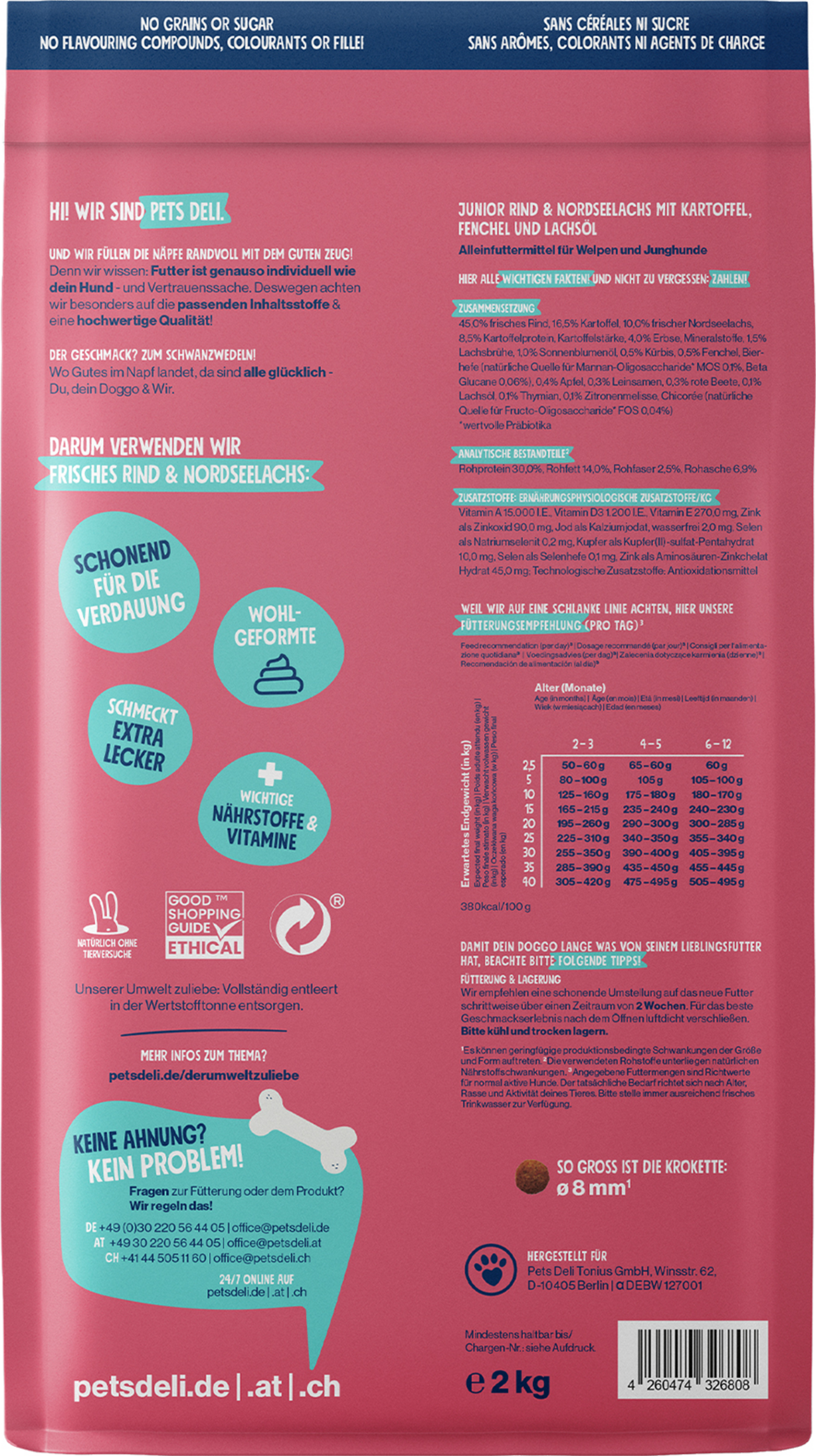 Um das schnelle Wachstum Ihres Doggos bestmöglich zu unterstützen, ist die Wahl eines Juniorfutters in jedem Fall erforderlich. Das knackige Trockenfutter Rind & Nordseelachs mit Kartoffel, Fenchel & Lachsöl ist optimal auf die Bedürfnisse junger Hunde abgestimmt und macht jede Mahlzeit zu einem ganz besonderen Leckerbissen. Viel frisches Fleisch vom Rind sowie frischen Nordseelachs sind reich an wertvollen Proteinen, die ihrem Hund viel Energie und Kraft geben. Die aus dem Fleisch gewonnenen B-Vitamine sind unter anderem ein wichtiger Bestandteil eines intakten Stoffwechsels und der Blutbildung.