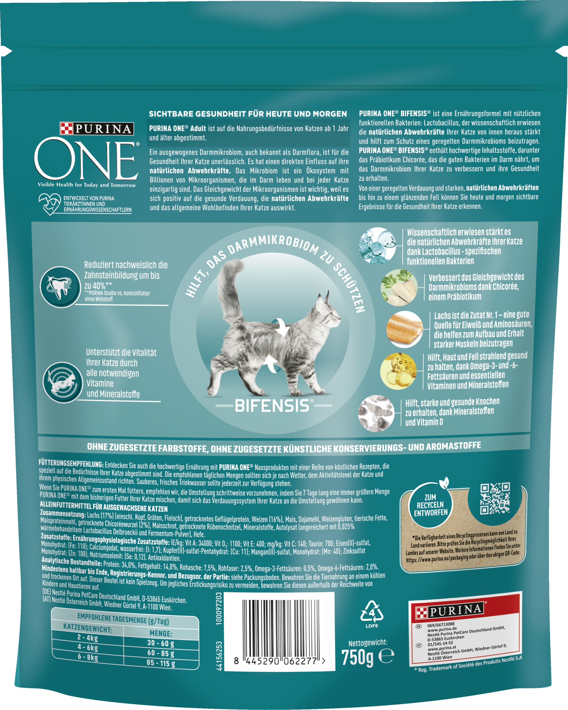 PURINA ONE BIFENSIS ist eine Ernährungsformel mit nützlichen funktionellen Bakterien: Lactobacillus, der wissenschaftlich erwiesen die natürlichen Abwehrkräfte deiner Katze von innen heraus stärkt und hilft zum Schutz eines geregelten Darmmikrobioms beizutragen. PURINA ONE BIFENSIS enthält hochwertige Inhaltsstoffe, darunter das Präbiotikum Chicorée, das die guten Bakterien im Darm nährt, um das Darmmikrobiom deiner Katze zu verbessern und ihre Gesundheit zu erhalten. Von einer geregelten Verdauung und starken, natürlichen Abwehrkräften bis hin zu einem glänzenden Fell kannst du heute und morgen sichtbare Ergebnisse für die Gesundheit deiner Katze erkennen.