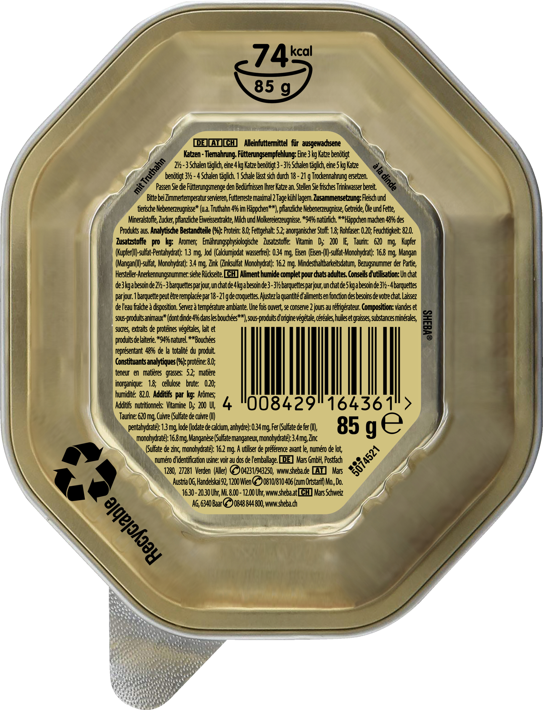 Protein: 8.0; Fettgehalt: 5.2; anorganischer Stoff: 1.8; Rohfaser: 0.20; Feuchtigkeit: 82.0. Brennwert: 74 kcal/85 g