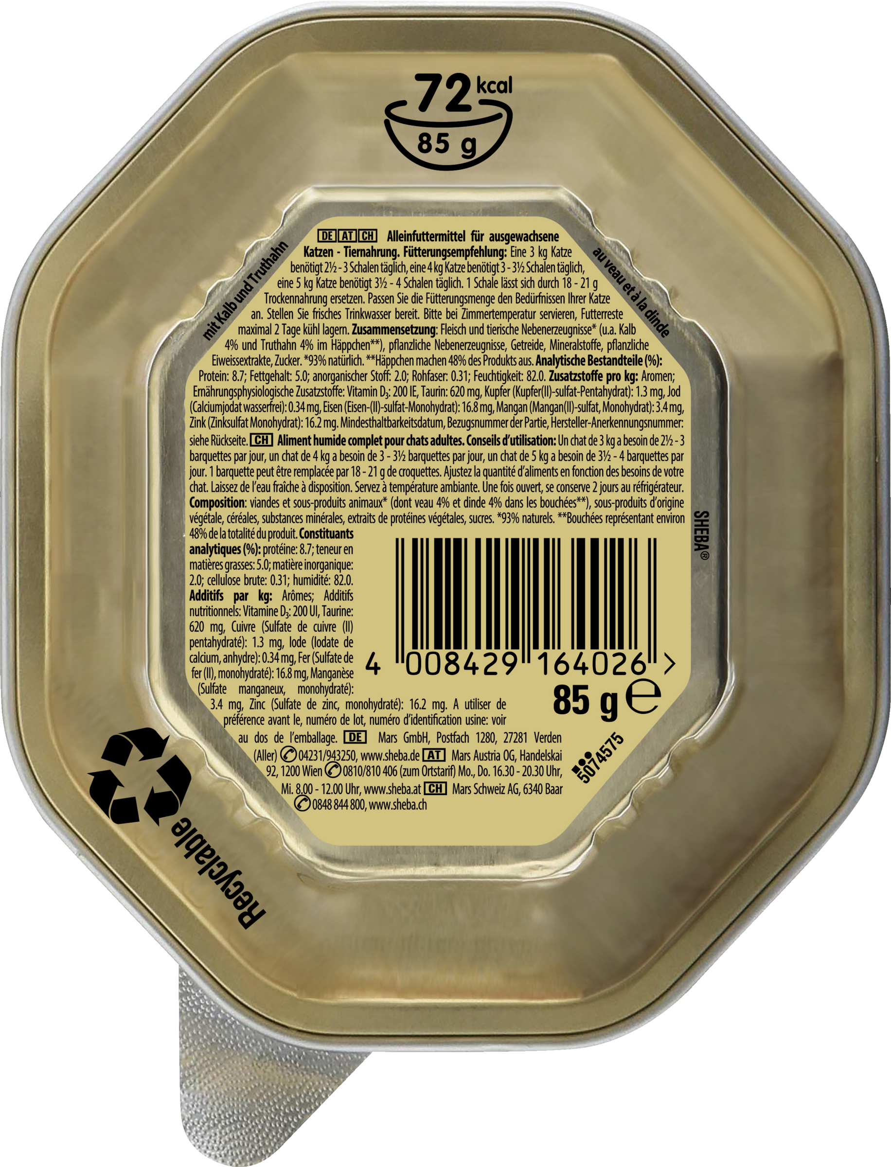 Eine 3 kg Katze benötigt 2½ - 3 Schalen täglich, eine 4 kg Katze benötigt 3 - 3½ Schalen täglich, eine 5 kg Katze benötigt 3½ - 4 Schalen täglich. 1 Schale lässt sich durch 18-21 g Trockennahrung ersetzen. Passen Sie die Fütterungsmenge den Bedürfnissen Ihrer Katze an. Stellen Sie frisches Trinkwasser bereit. Bitte bei Zimmertemperatur servieren.