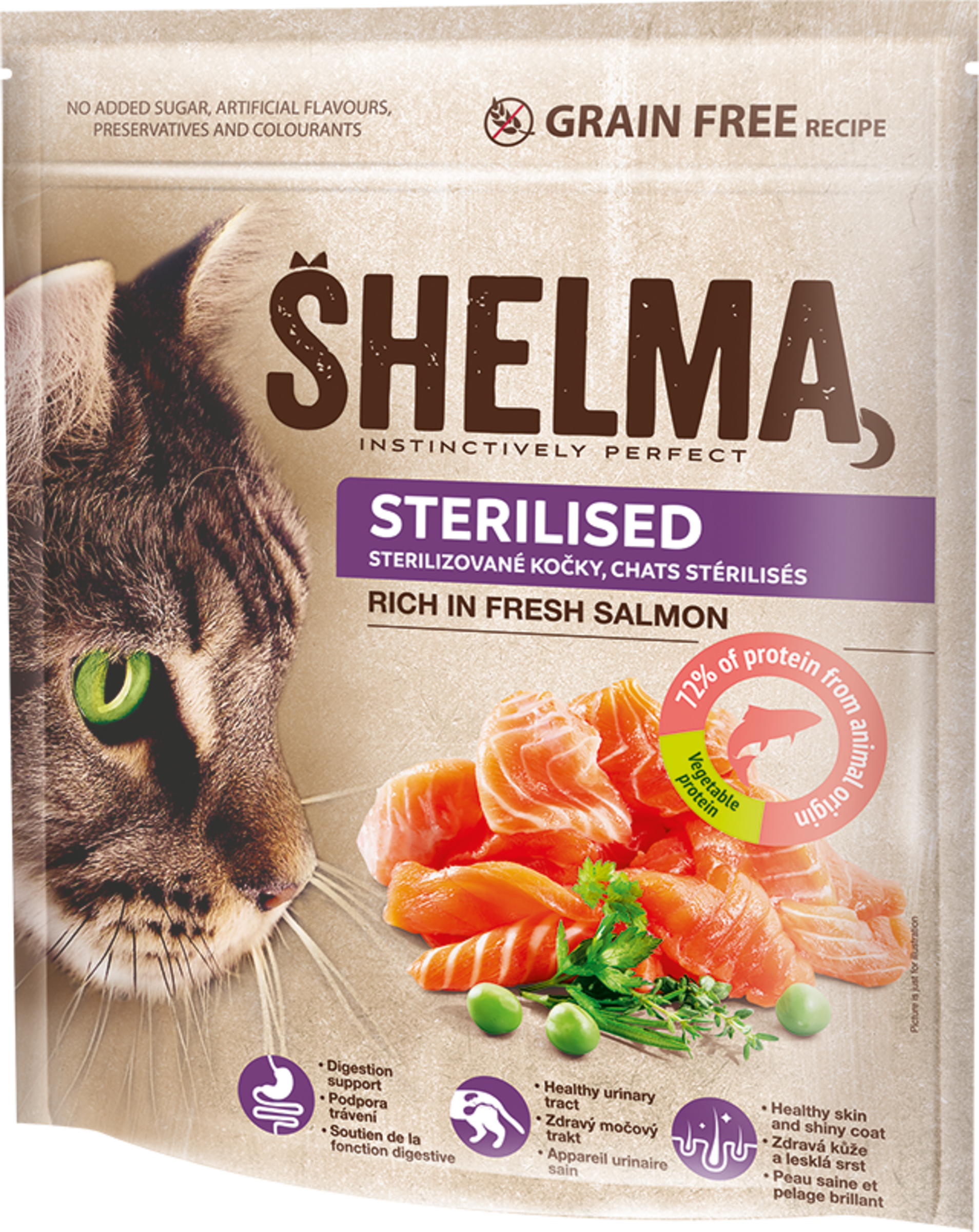 Die Produkte von Shelma sind hochwertige Futtermittel mit einem hohen Gehalt an tierischen Proteinen. Zur Unterstützung des Immunsystems enthält das Shelma Trockenfutter Spirulina und Sanddorn, beides Superfoods, sowie Kräuter: Rosmarin, Thymian und Petersilie. Alle sind natürliche Quellen von Antioxidantien, die zur Verbesserung der natürlichen Abwehrkräfte der Katze beitragen. Die knusprige Textur der Kroketten hilft, die Bildung von Zahnstein und Plaque zu verhindern und unterstützt ein gesundes Gebiss und durch die Zugabe von Omega-3-Fettsäuren auch eine gesunde Haut und glänzendes Fell. All dies ohne Zugabe von Zucker, Getreide, künstlichen Aromen, Konservierungs- und Farbstoffen. Verpackt im praktischen wiederschließbaren Beutel.