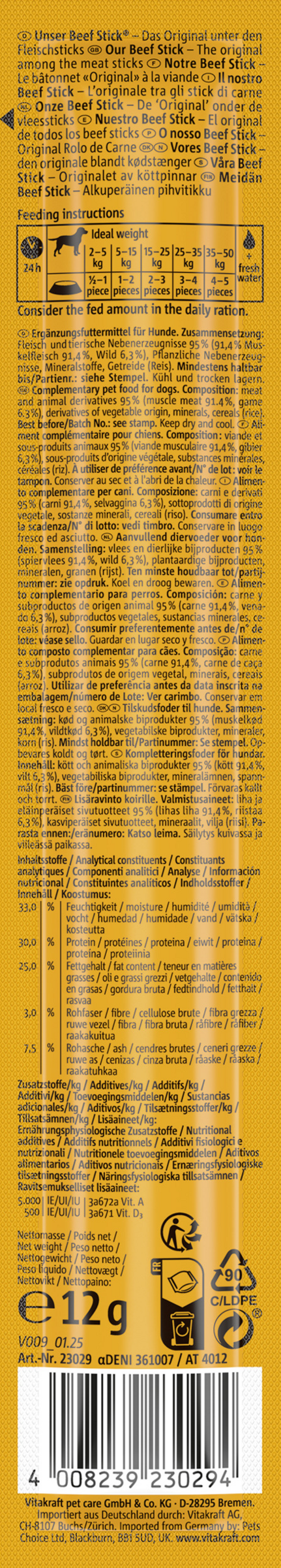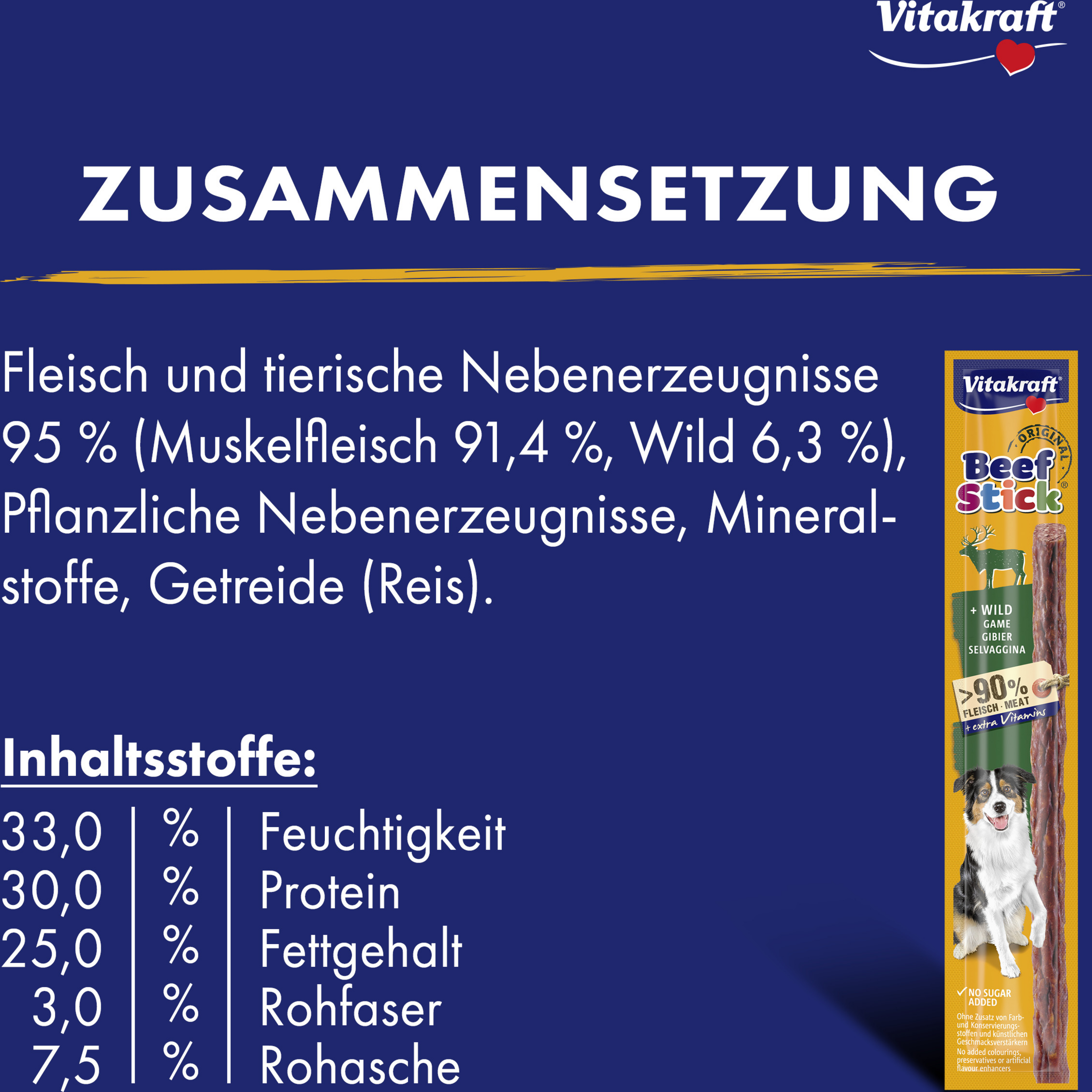 Ein Vitakraft Beef Stick® lässt einfach jedes Hunde-Herz höher schlagen! Das Original unter den Fleischsticks überzeugt große und kleine Vierbeiner gleichermaßen – durch den einzigartigen, herzhaften Geschmack, den absolut köstlichen Geruch und einen extra hohen Fleischanteil. Perfekt zum Verwöhnen, Belohnen oder einfach für den kleinen Hunger zwischendurch! Besonders praktisch: Durch die frischeversiegelte Aufreißpackung ist der Beef Stick® Original auch ideal für unterwegs.