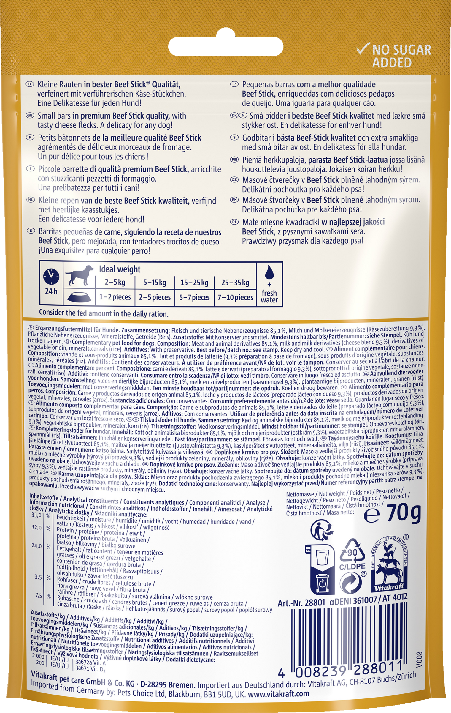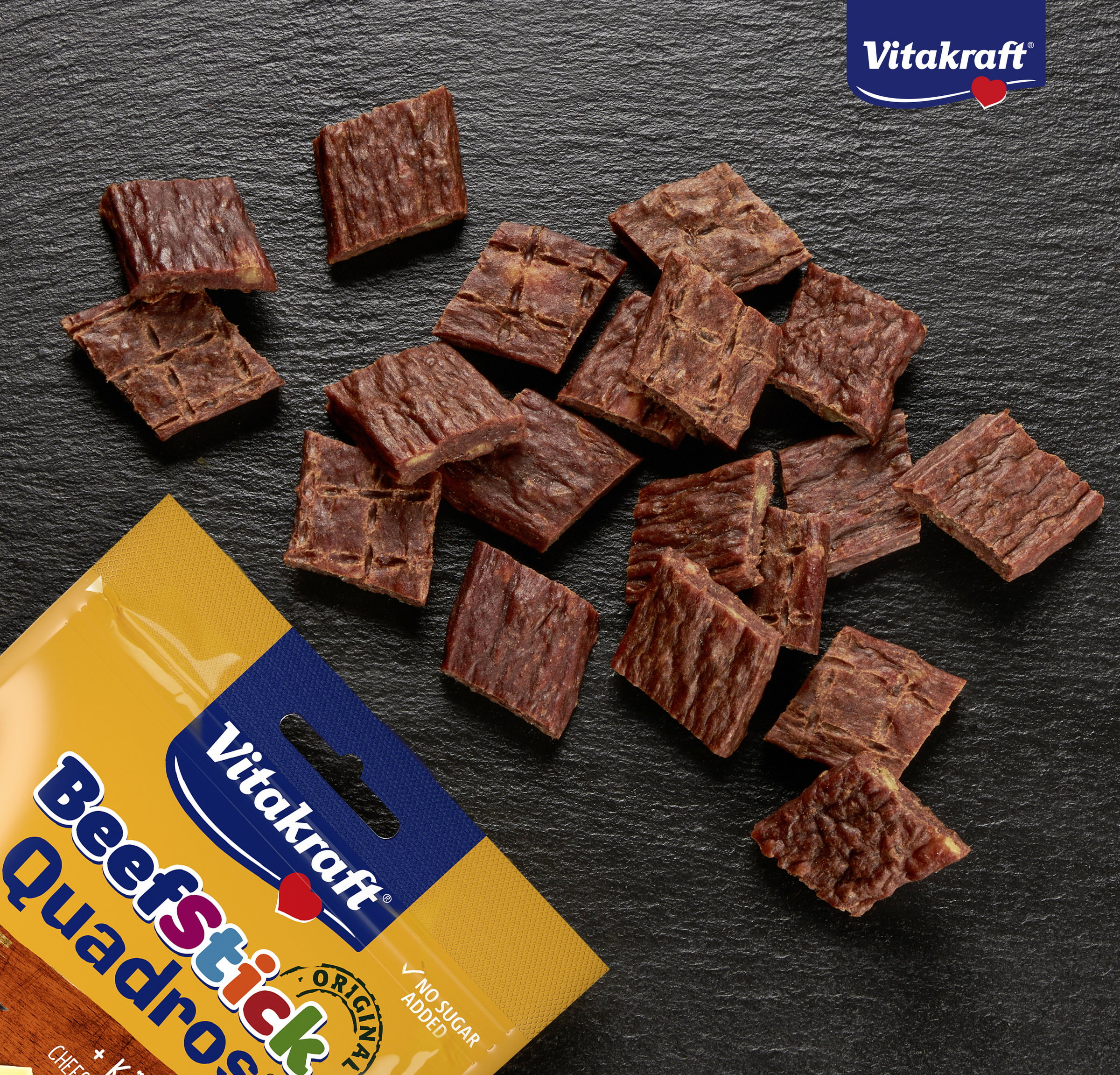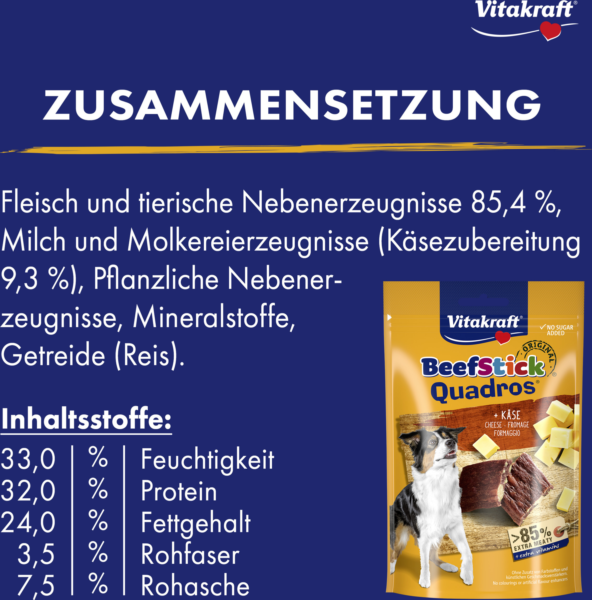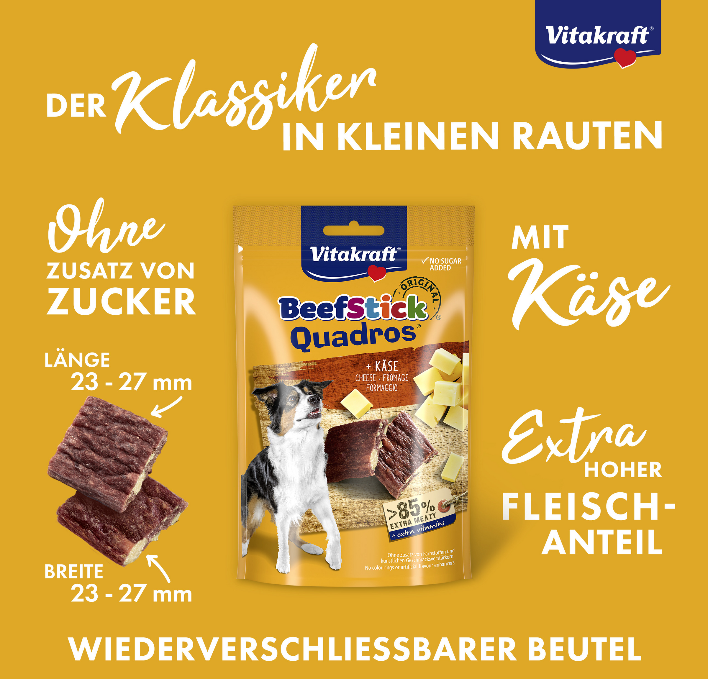 Die fleischigen Beef Stick® Quadros® werden mit extra viel Liebe nach bewährter original Beef Stick® Rezeptur hergestellt. Zudem enthalten die köstlichen kleinen Rauten ein raffiniertes Extra: verführerische Käse-Stückchen, die dank des schonenden Herstellungsverfahrens sogar auf den ersten Blick erkennbar sind. Eine absolute Delikatesse für Ihren Hund!