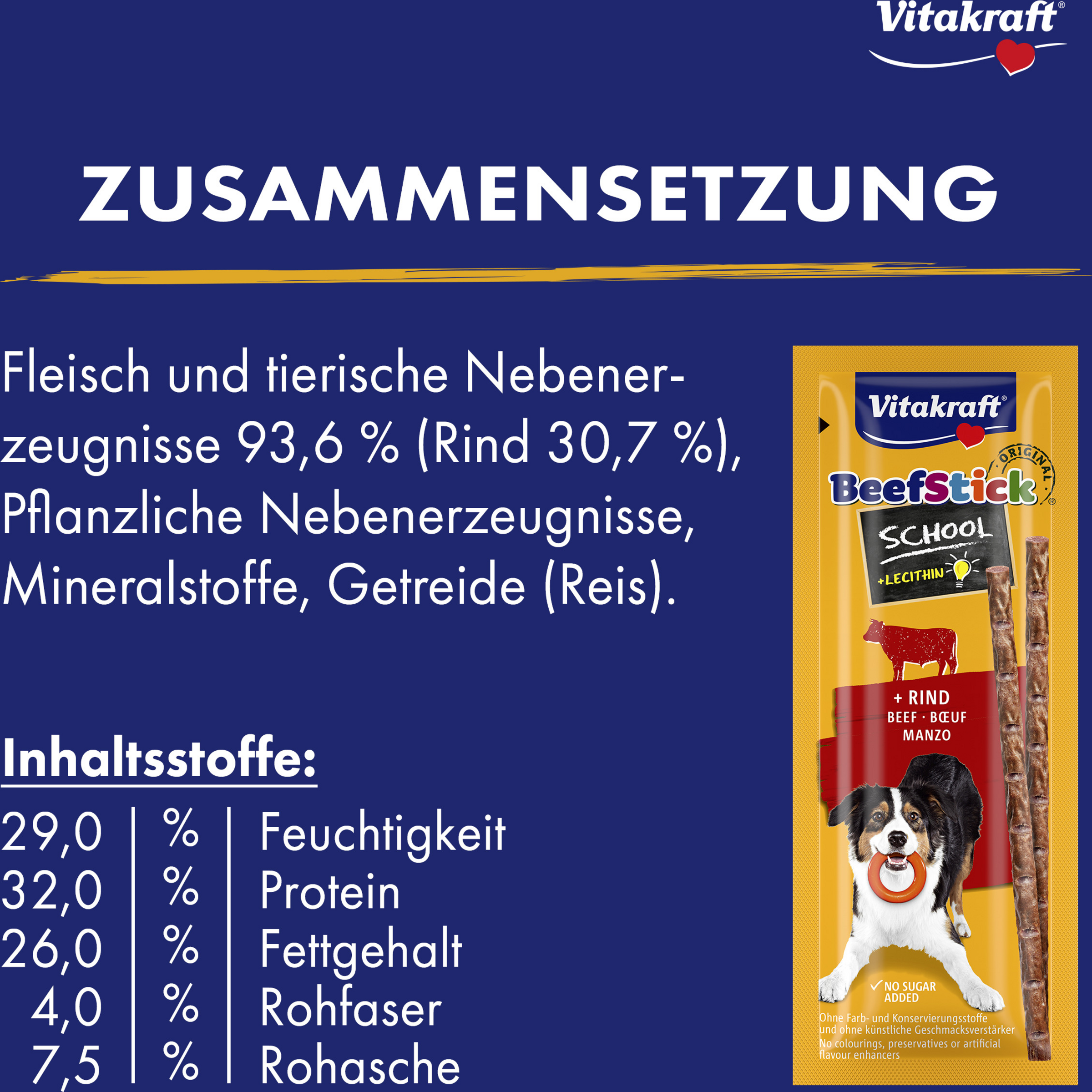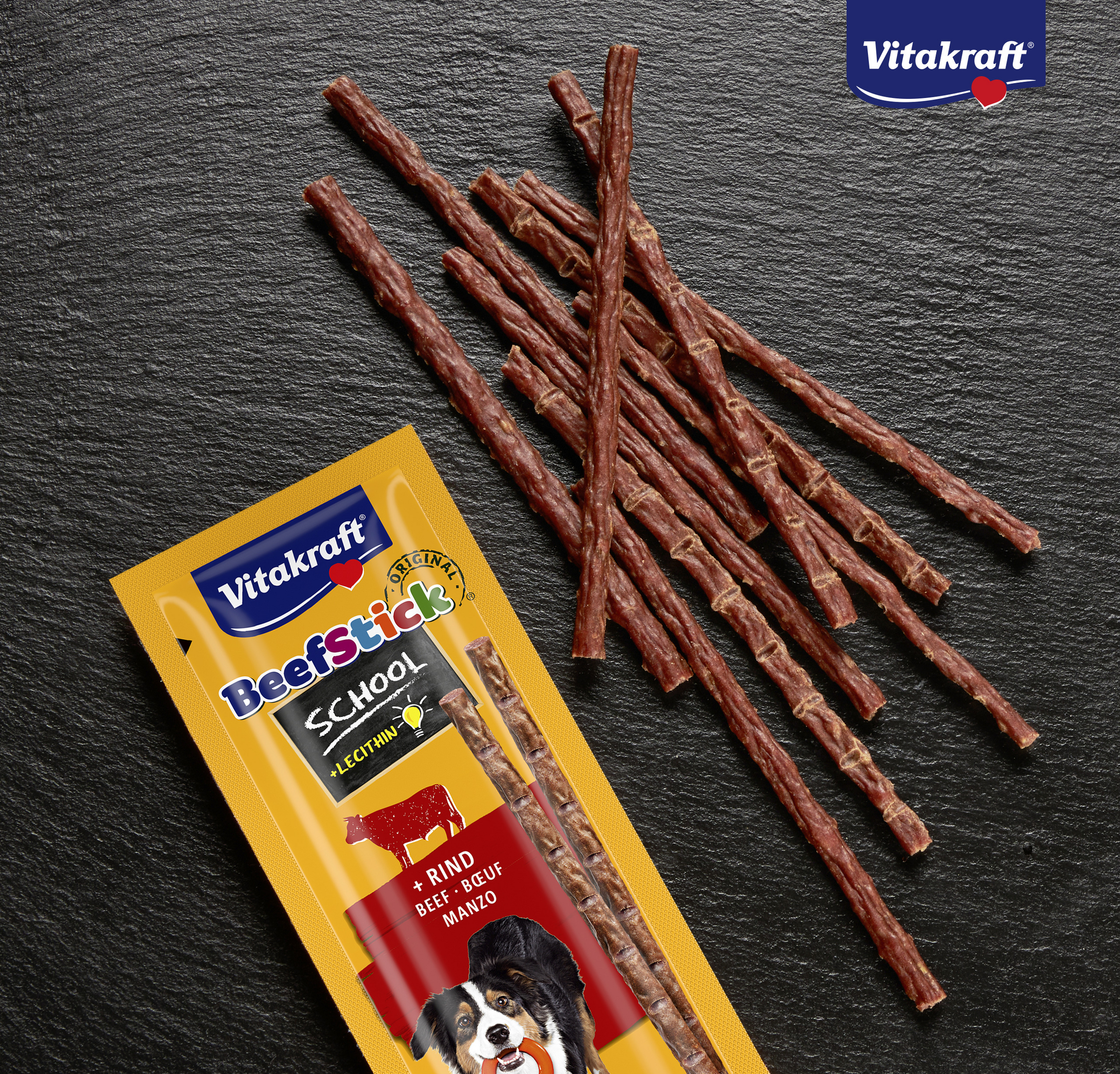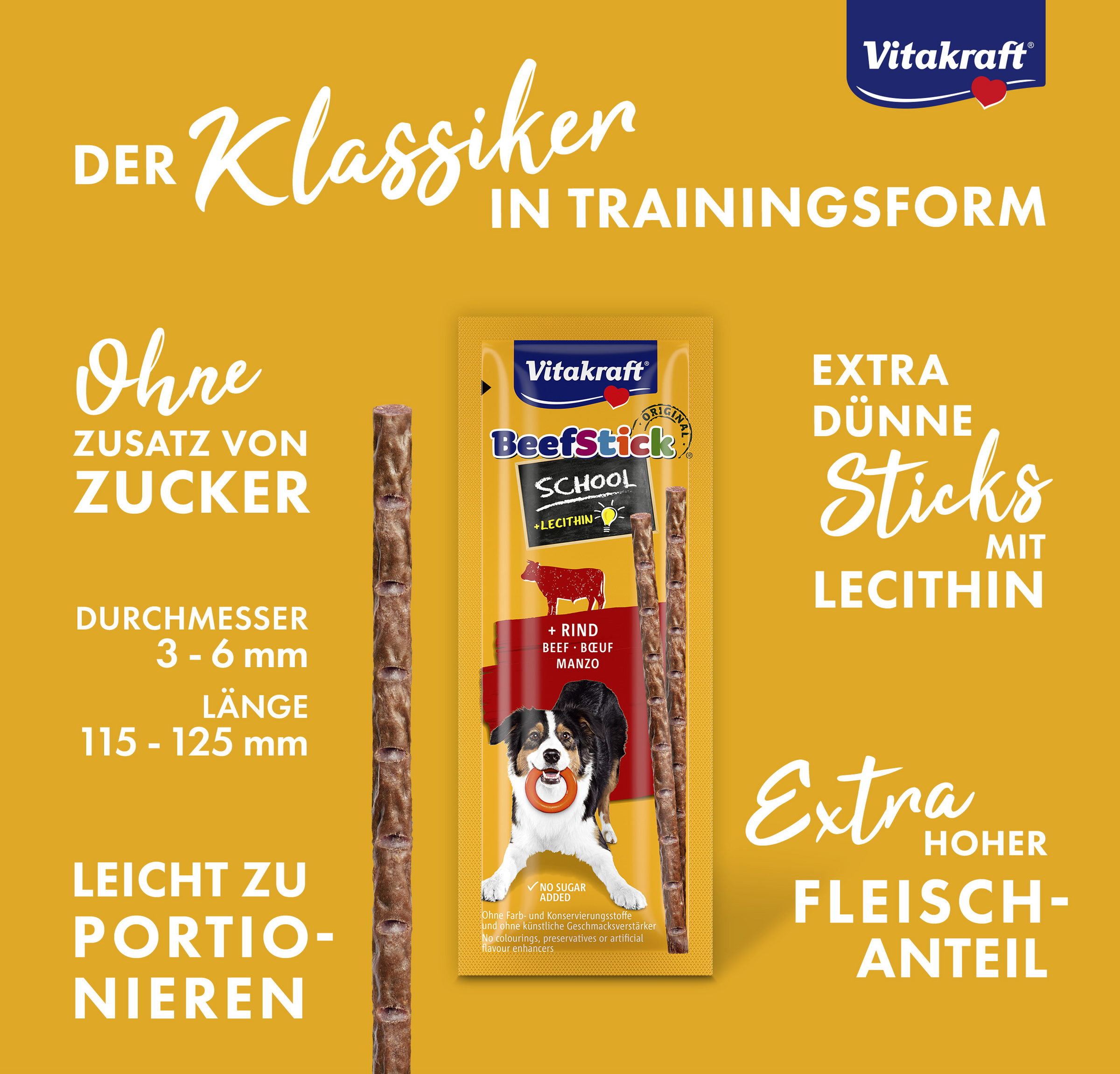 Mit einem Beef-Stick® School lässt sich Ihr Hund garantiert besonders gerne für Lernerfolge belohnen: Die extra dünnen Fleisch-Sticks schmecken einzigartig herzhaft, riechen köstlich und sind zudem mit Lecithin angereichert– damit die Konzentration Ihres Vierbeiners optimal unterstützt wird. Der ideale Motivationssnack fürs Hundetraining!