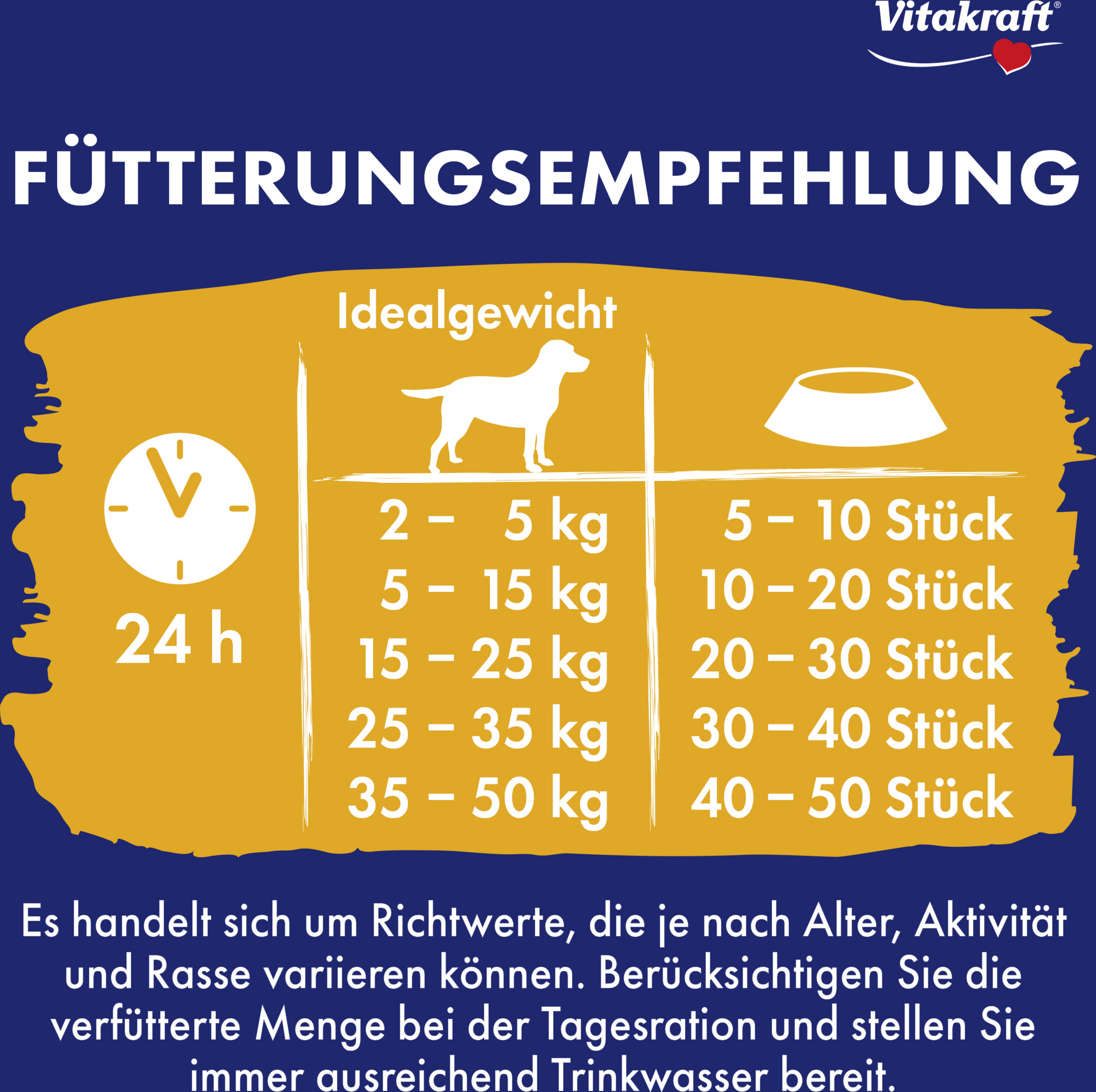 Es handelt sich um Richtwerte, die je nach Alter, Aktivität und Rasse variieren können. Berücksichtigen Sie die verfütterte Menge bei der Tagesration und stellen Sie immer ausreichend Trinkwasser bereit.