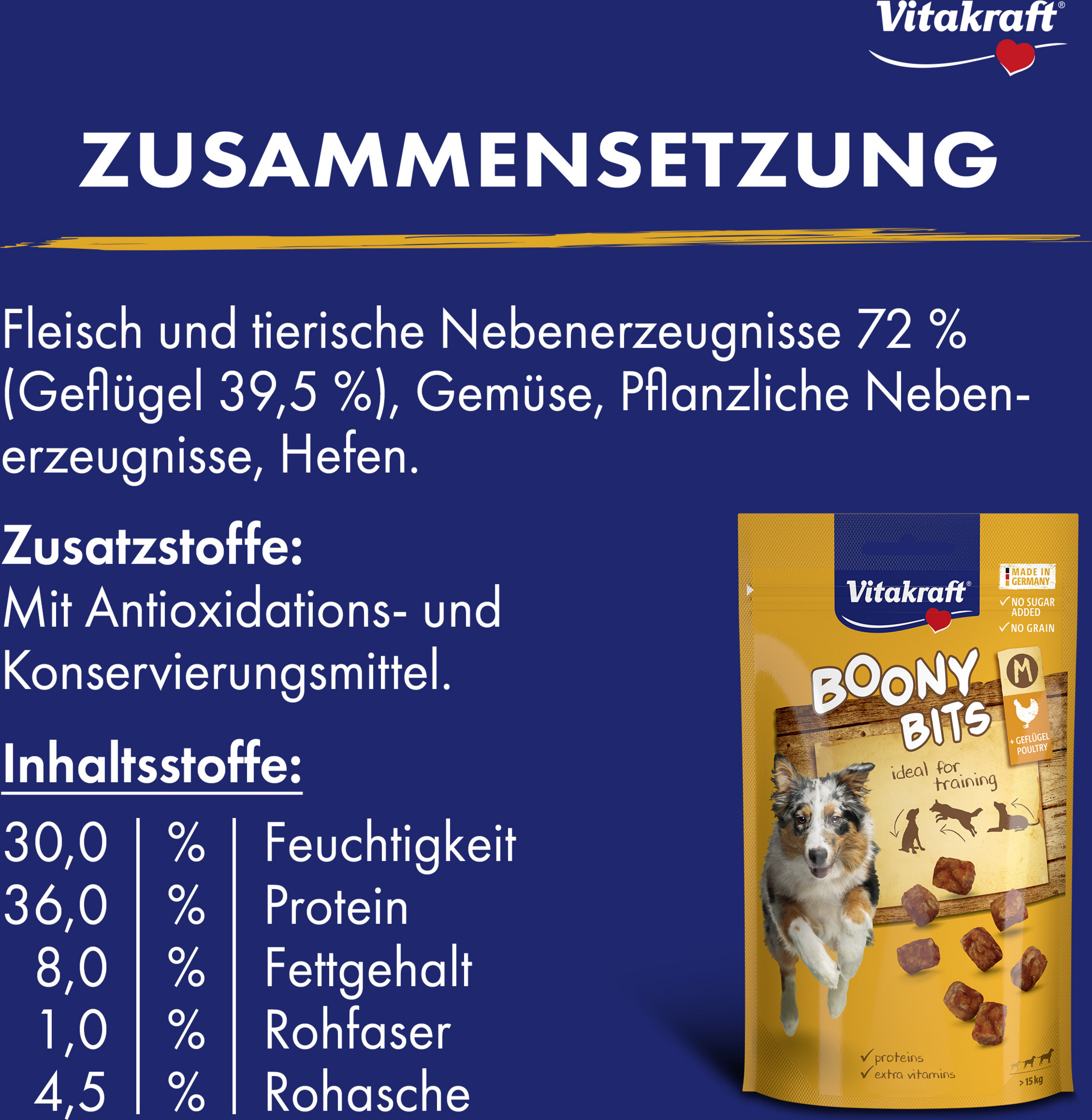 Die Boony Bits sind der köstliche Belohnungssnack und ideal fürs Training, ob im Hundesport oder in der Erziehung. Die erfolgreichen Leckerli sind in Größe M optimal für größere Hunde geeignet. Unwiderstehlich lecker und in perfekter Snackgröße: Die Boony Bits M passen in jede Jackentasche, ohne dabei unangenehm zu krümeln oder zu fetten. Im wiederverschließbaren Beutel stecken bis zu 100 Stück – für bis zu 100-mal motivierende oder belohnende Aufmerksamkeit für Ihren Vierbeiner. Boony Bits sind nach zuckerfreier Rezeptur hergestellt und enthalten gesunde Vitamine. Ideal für alle Hunde!