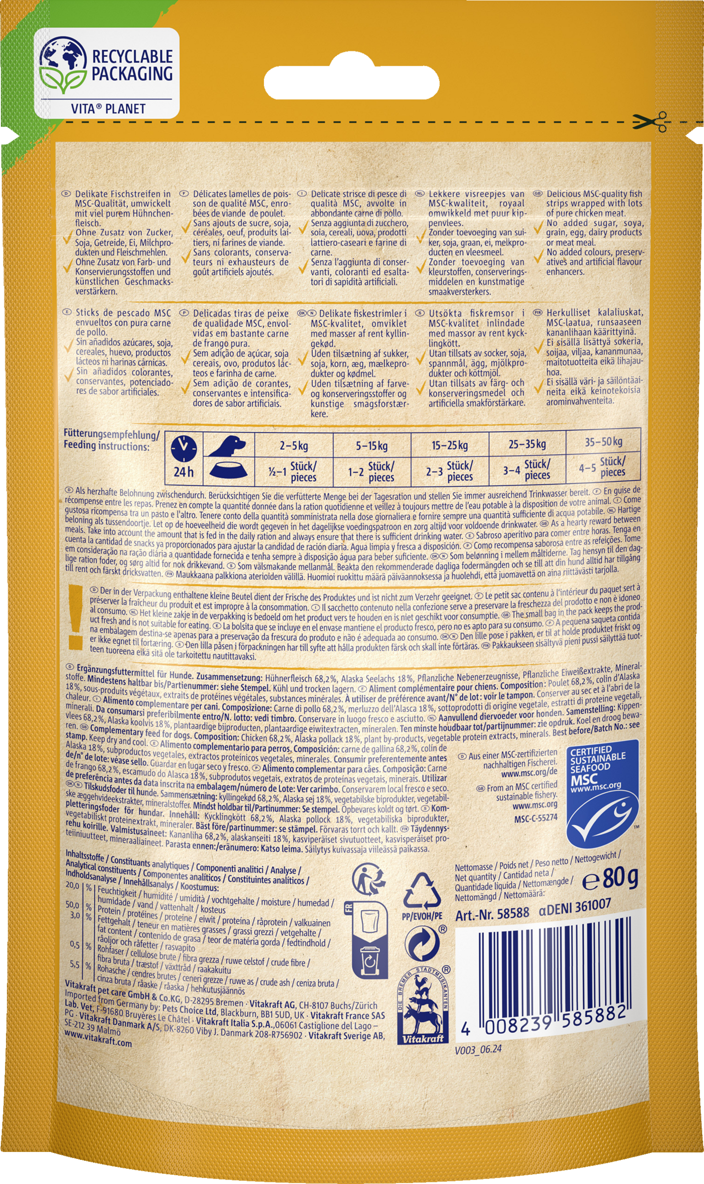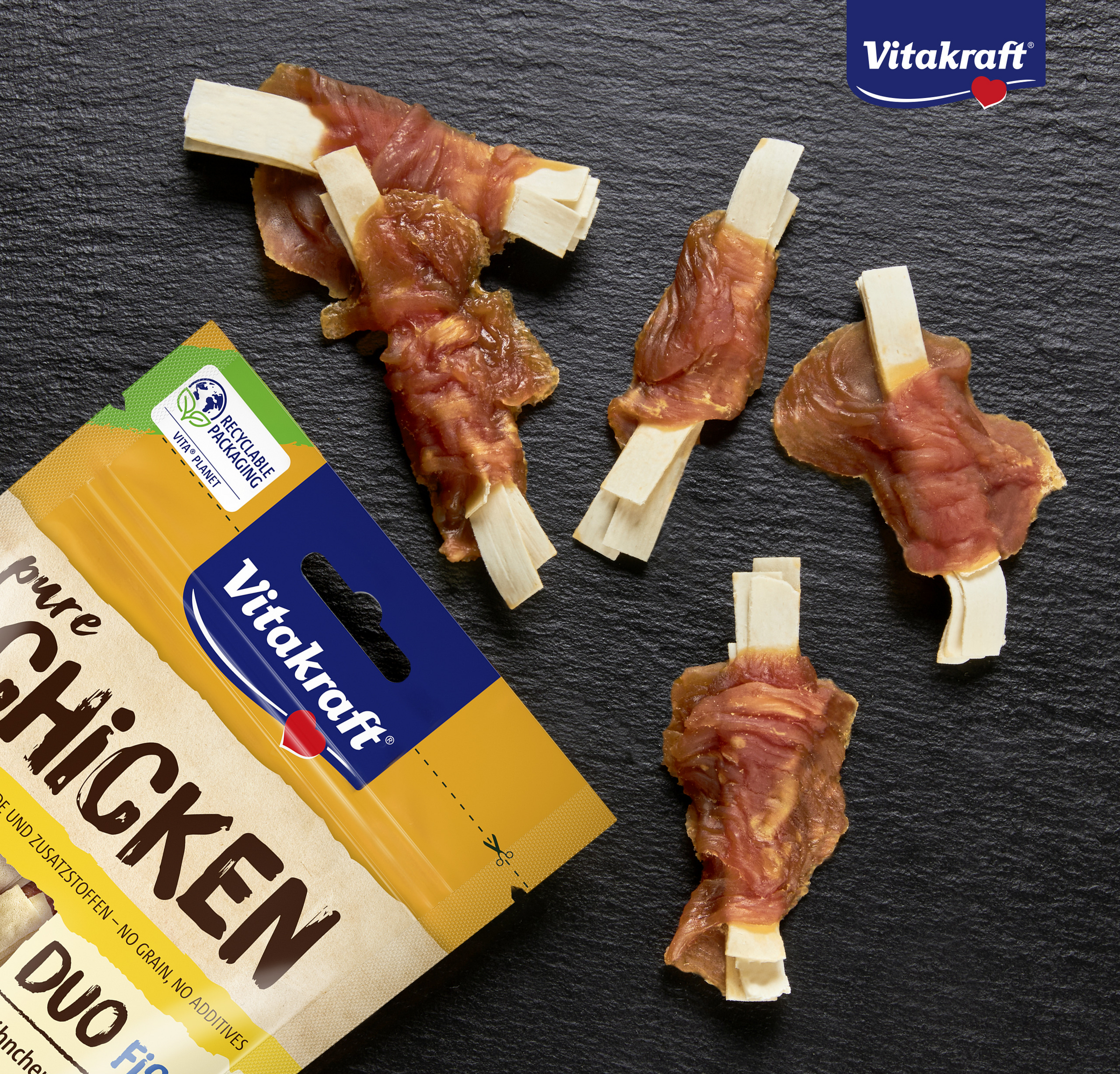 Schmackhafte Fischstreifen, umwickelt mit magerem Hühnchenfleisch – diesen hochwertigen Leckerbissen wird Ihr Hund garantiert lieben! Der raffinierte Snack wird mit viel herzhaftem Fleisch und Fisch und ohne Zusatz von Zucker, Getreide, Ei, Milchprodukten und Fleischmehlen zubereitet und eignet sich prima zur artgerechten Belohnung. Auch auf alle Zusatzstoffe, von Konservierungsmitteln bis hin zu Geschmacksverstärkern, wird bei der Herstellung konsequent verzichtet.