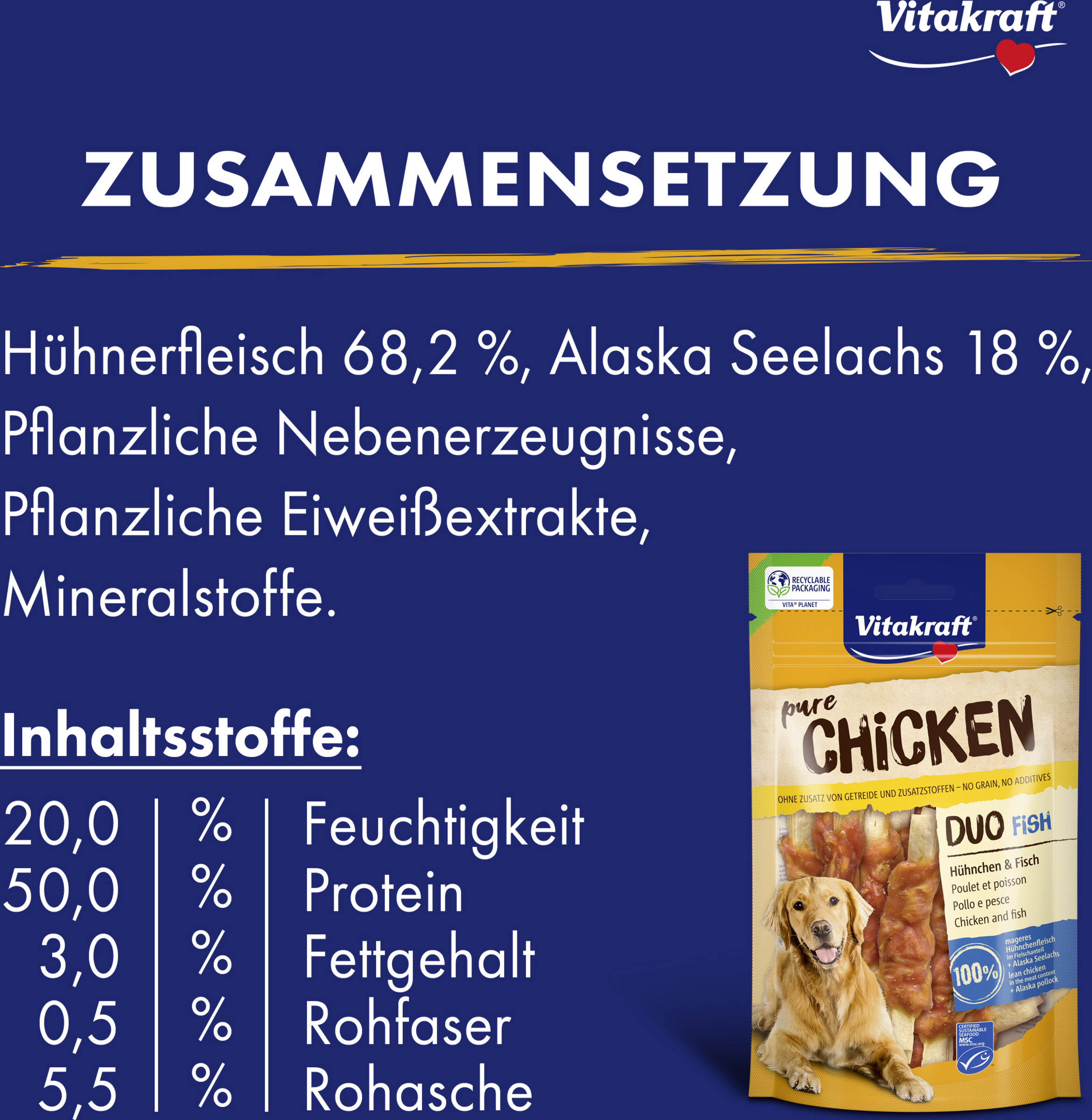 Hühnerfleisch 68,2%, Alaska Seelachs 18%, pflanzliche Nebenerzeugnisse, pflanzliche Eiweißextrakte, Mineralstoffe.