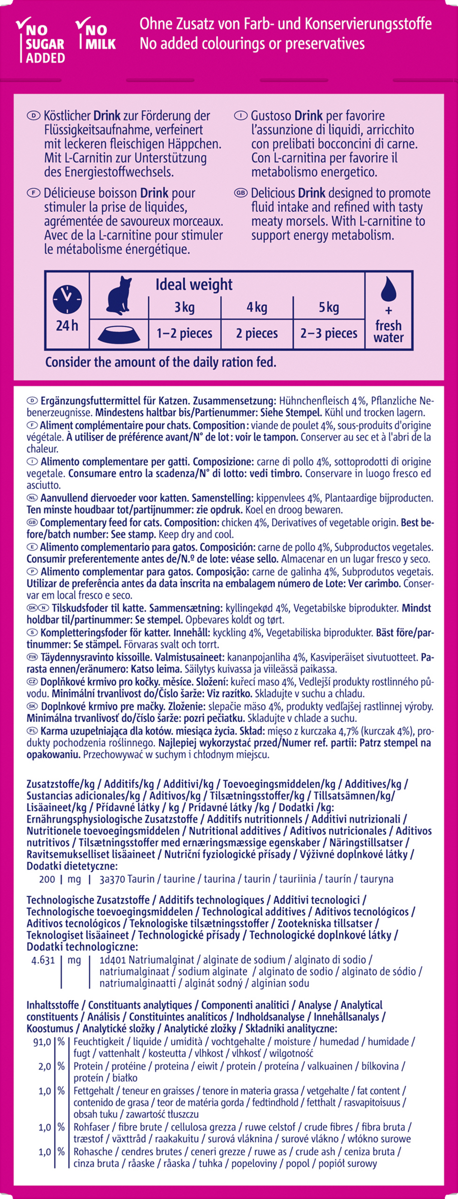 Zusatzstoffe/kg: Ernährungsphysiologische Zusatzstoffe: 200 mg 3a370 Taurin. Technologische Zusatzstoffe: 4631 mg 1d401 Natriumalginat.