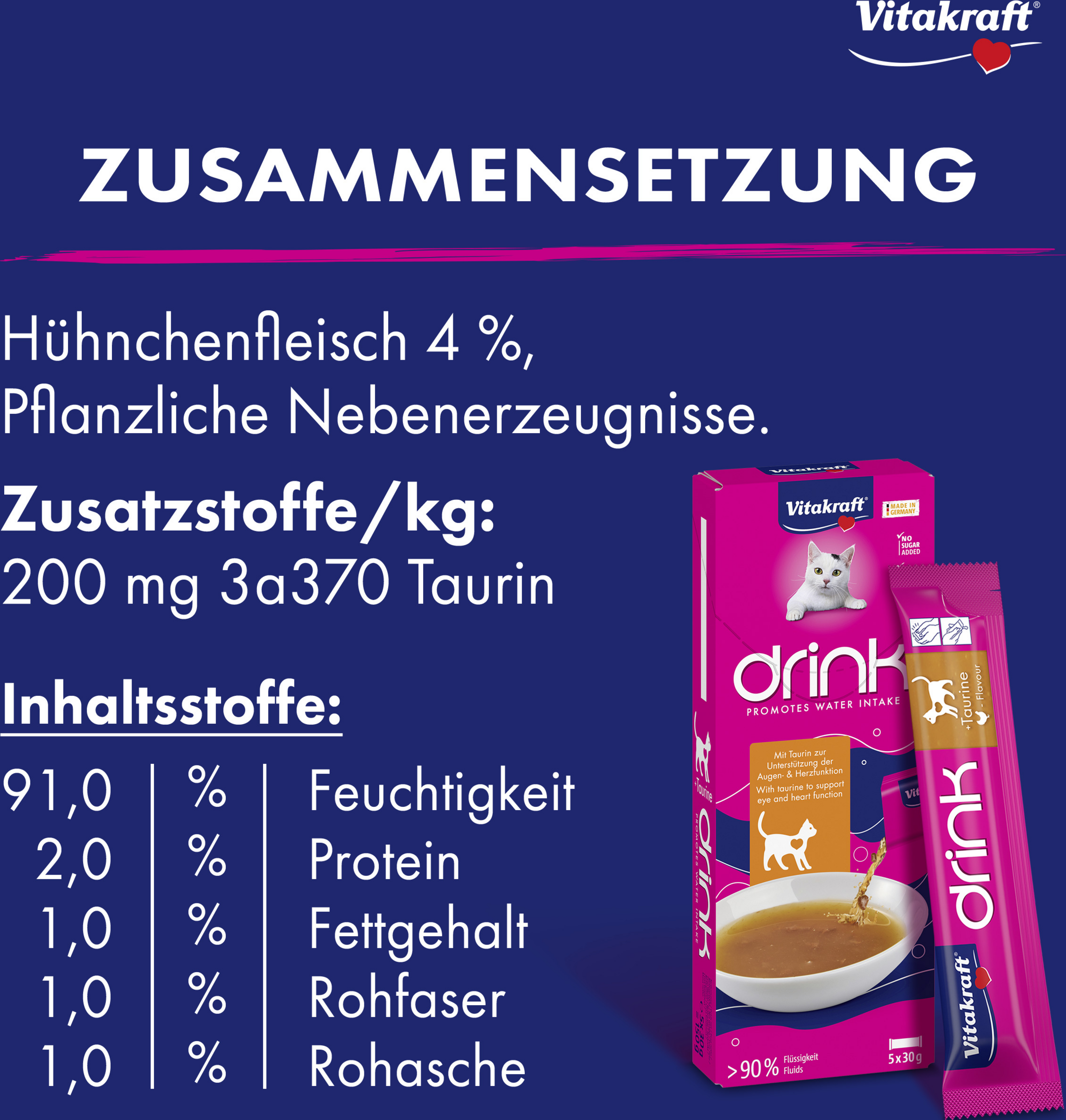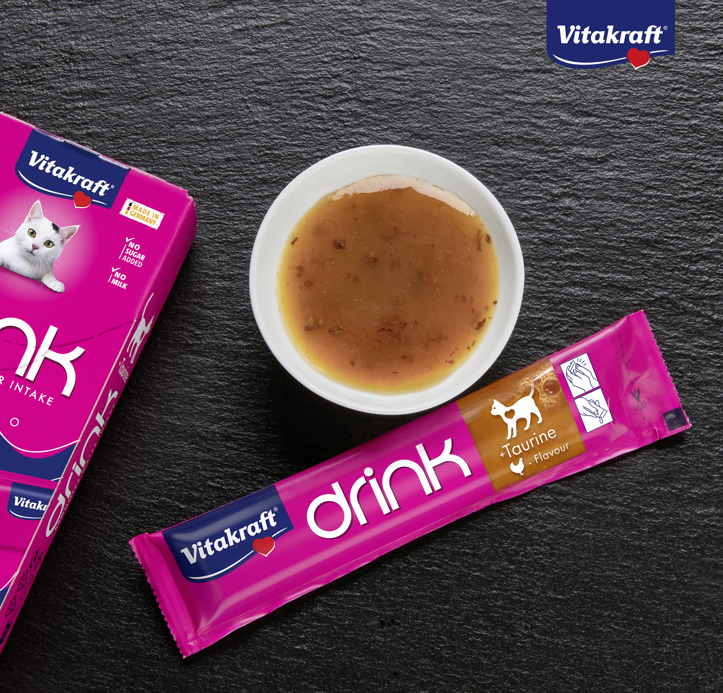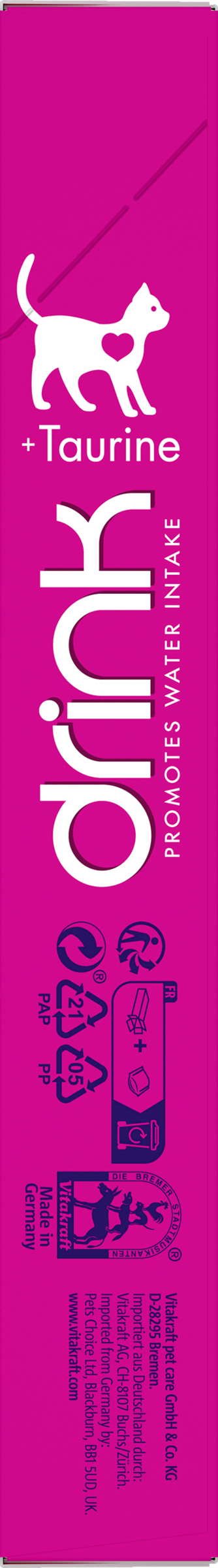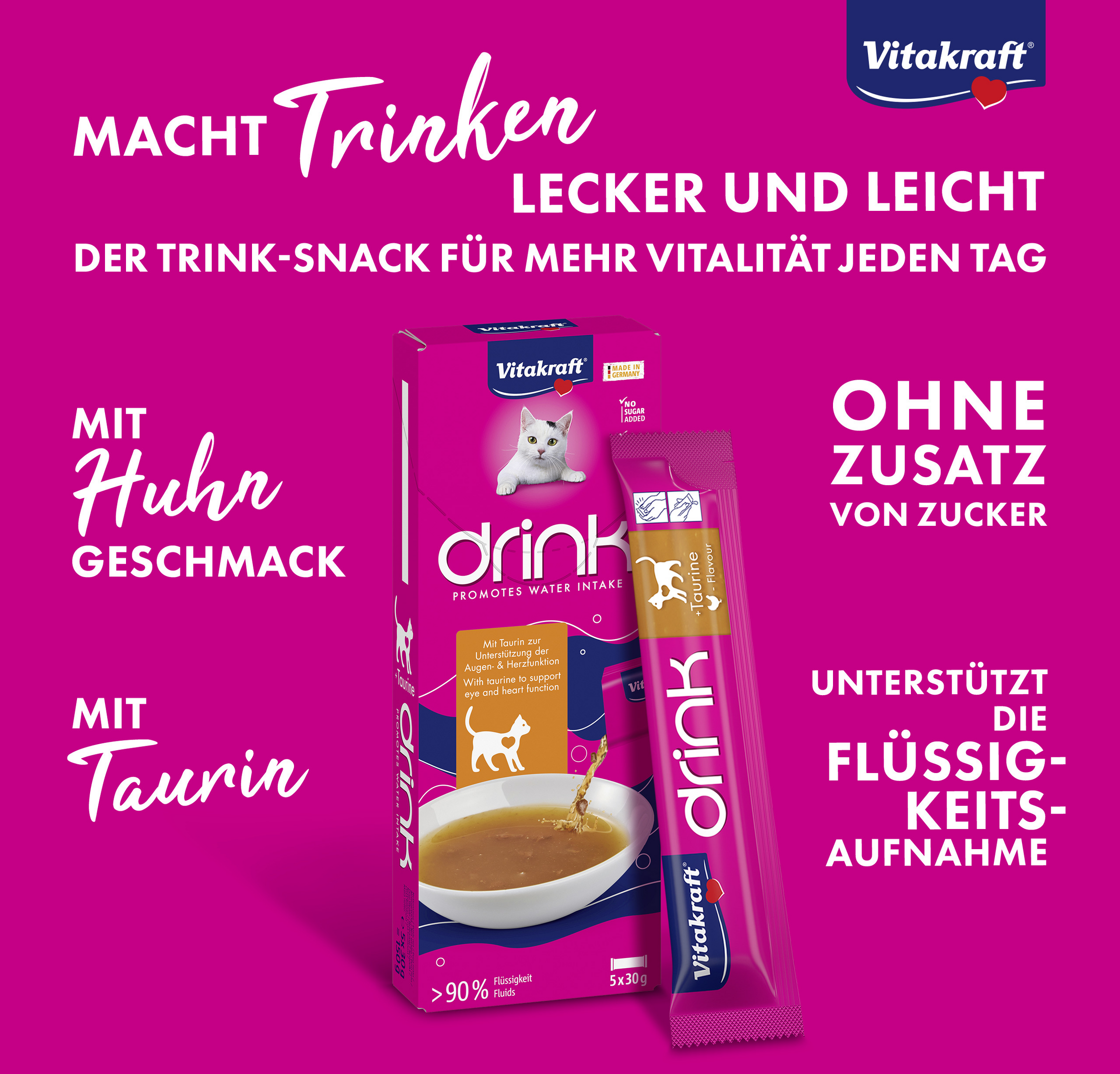 Ein ausgewogener Flüssigkeitshaushalt ist essentiell wichtig für die Gesundheit deiner Katze. Der Vitakraft® Drink unterstützt eine positive Trinkroutine und Flüssigkeitsaufnahme, die Katzen brauchen – und ist dabei unwiderstehlich lecker. Die speziell abgestimmte Formel mit Taurin unterstützt eine gesunde Augen- und Herzfunktion. Der Vitakraft® Drink kommt in der köstlichen Geschmacksrichtung Huhn. In den praktischen Sachets bleibt jeder Drink frisch und ist außerdem perfekt portionierbar.