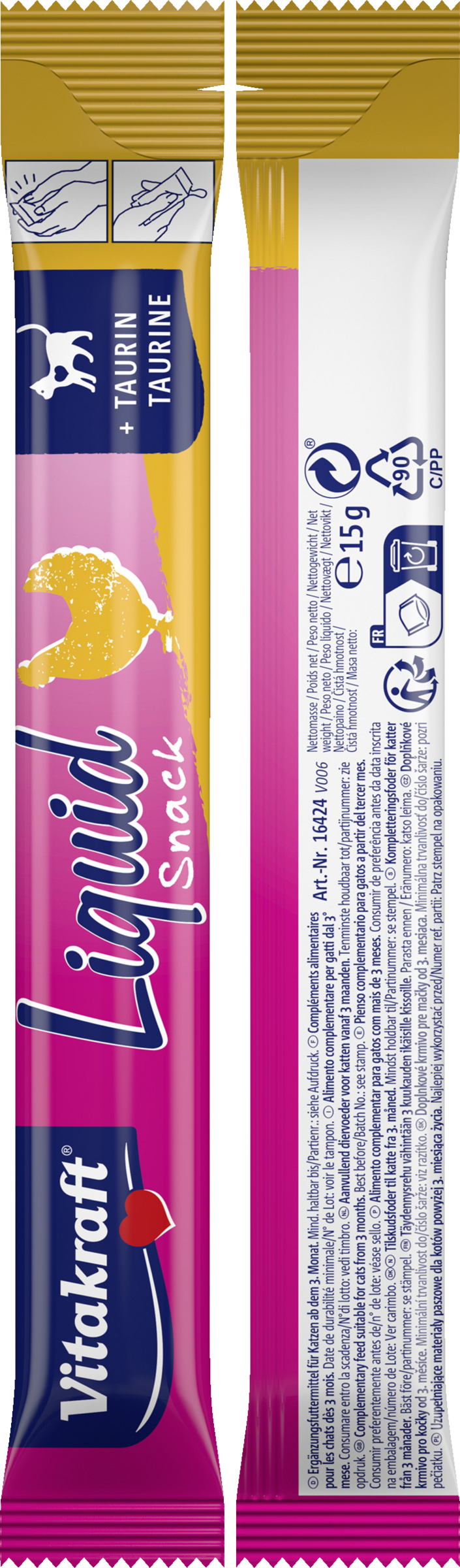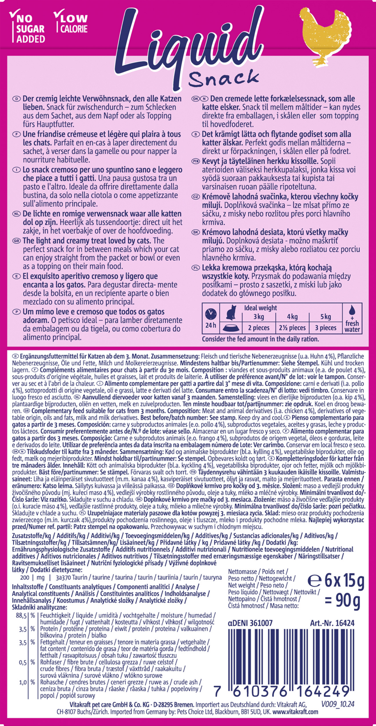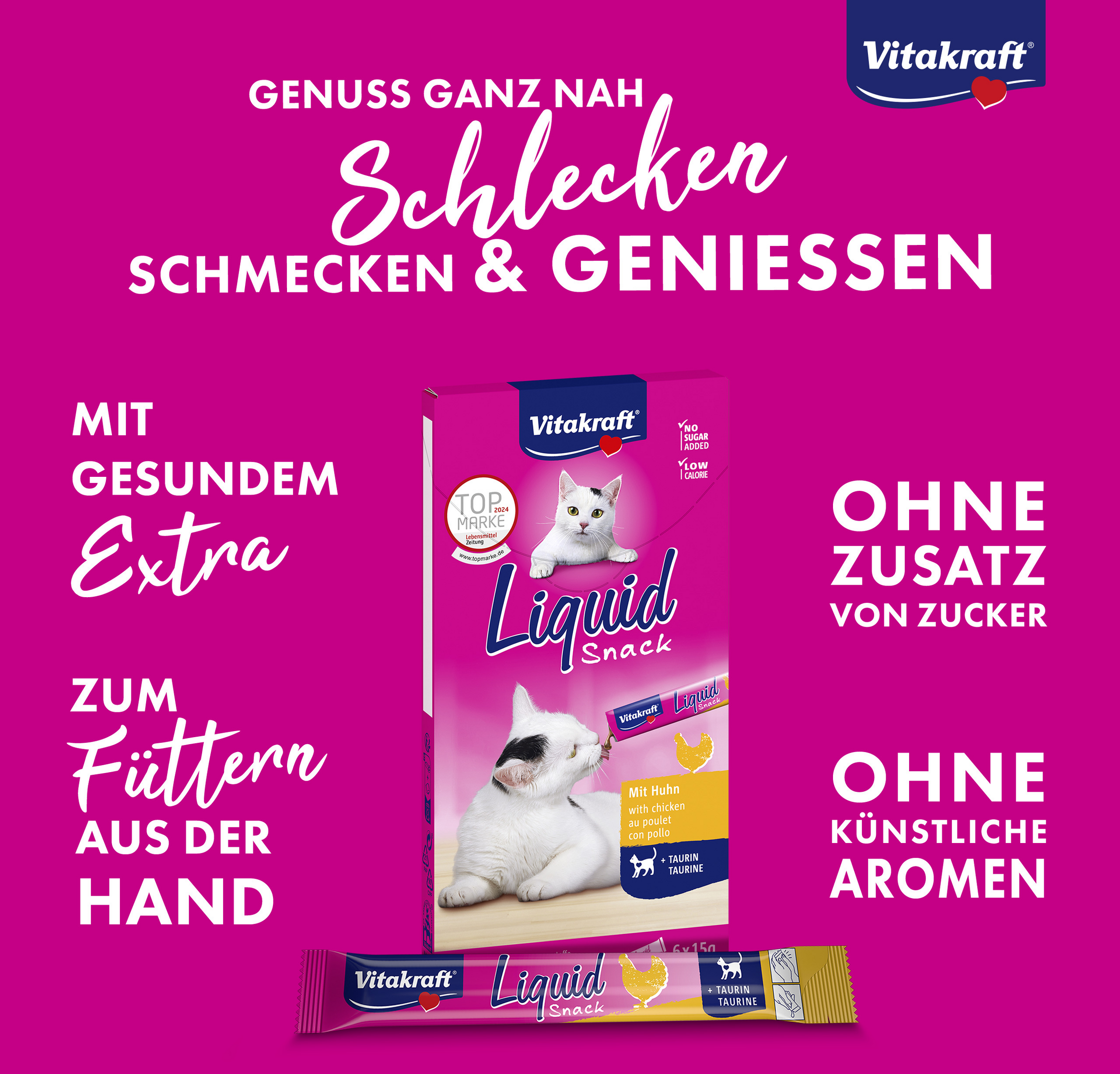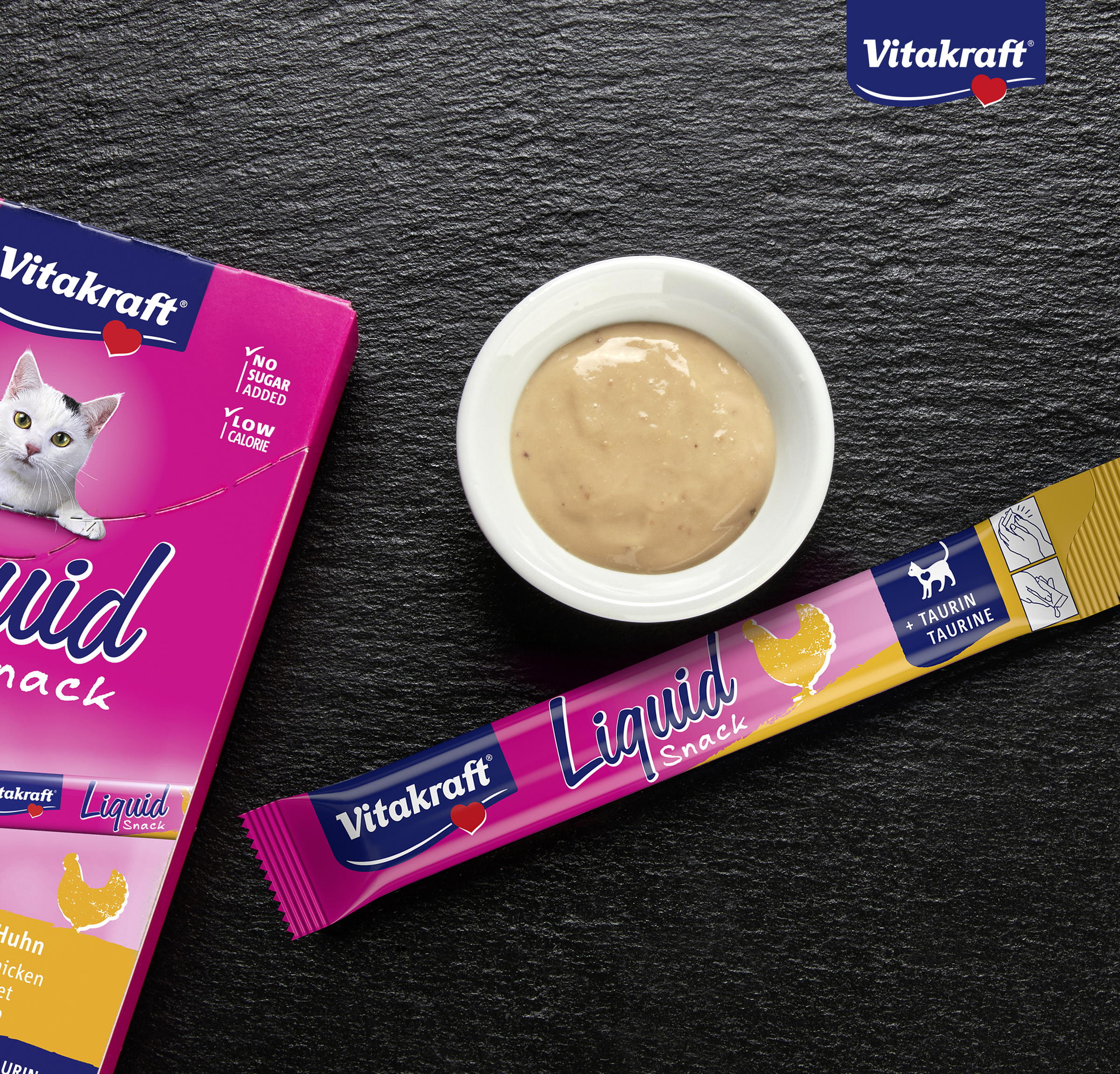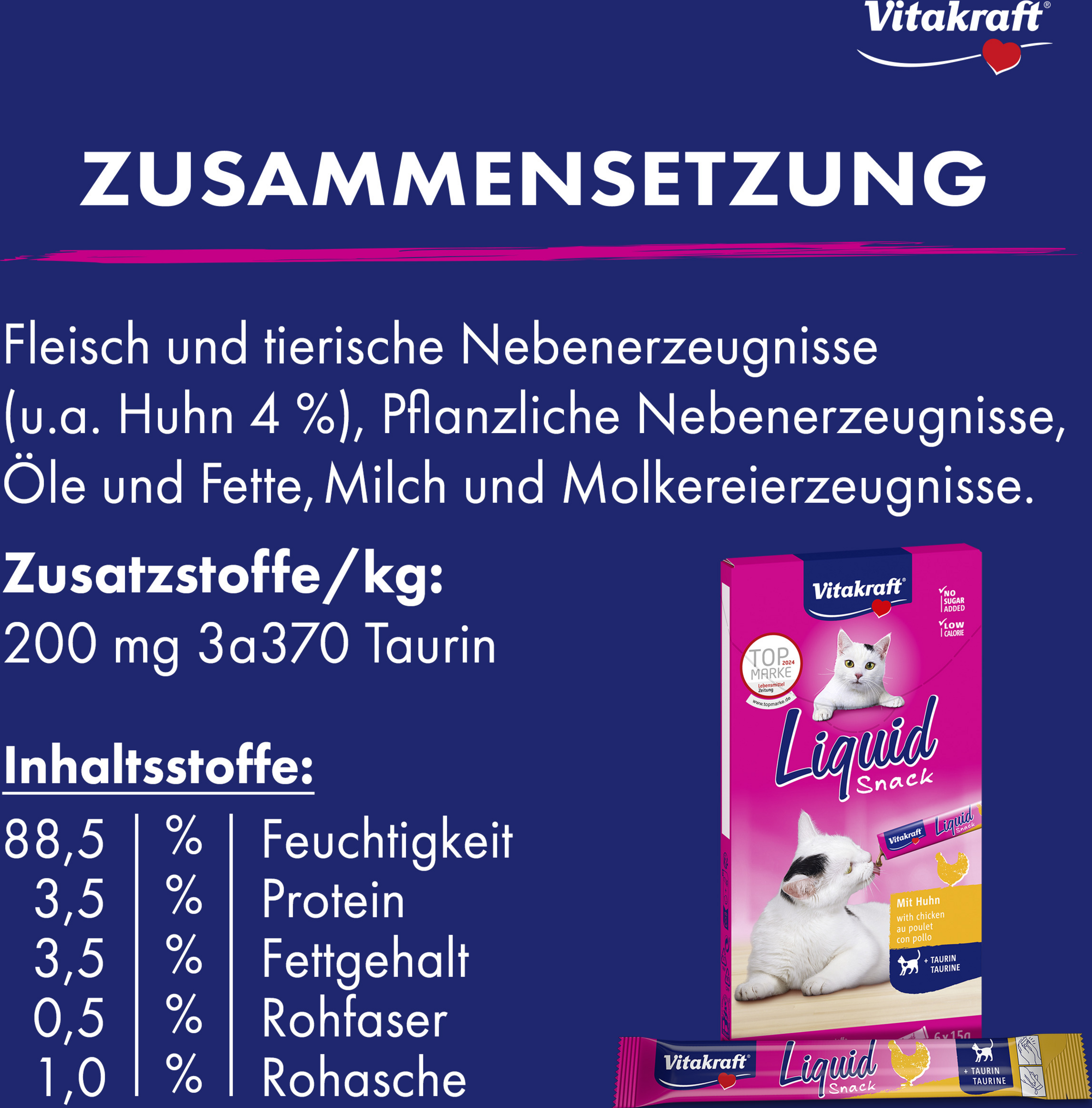 Die Liquid Snack von Vitakraft mit bekömmlichem Huhn schmeckt nicht nur unwiderstehlich lecker, er unterstützt dank enthaltenem Taurin auch noch die Augen- und Herzfunktion Ihrer Katze. Geben Sie den kalorienarmen, aber unwiderstehlichen Snack entweder pur, direkt aus der Hand, oder als Topping aufs Hauptfutter, um die Akzeptanz zu steigern.