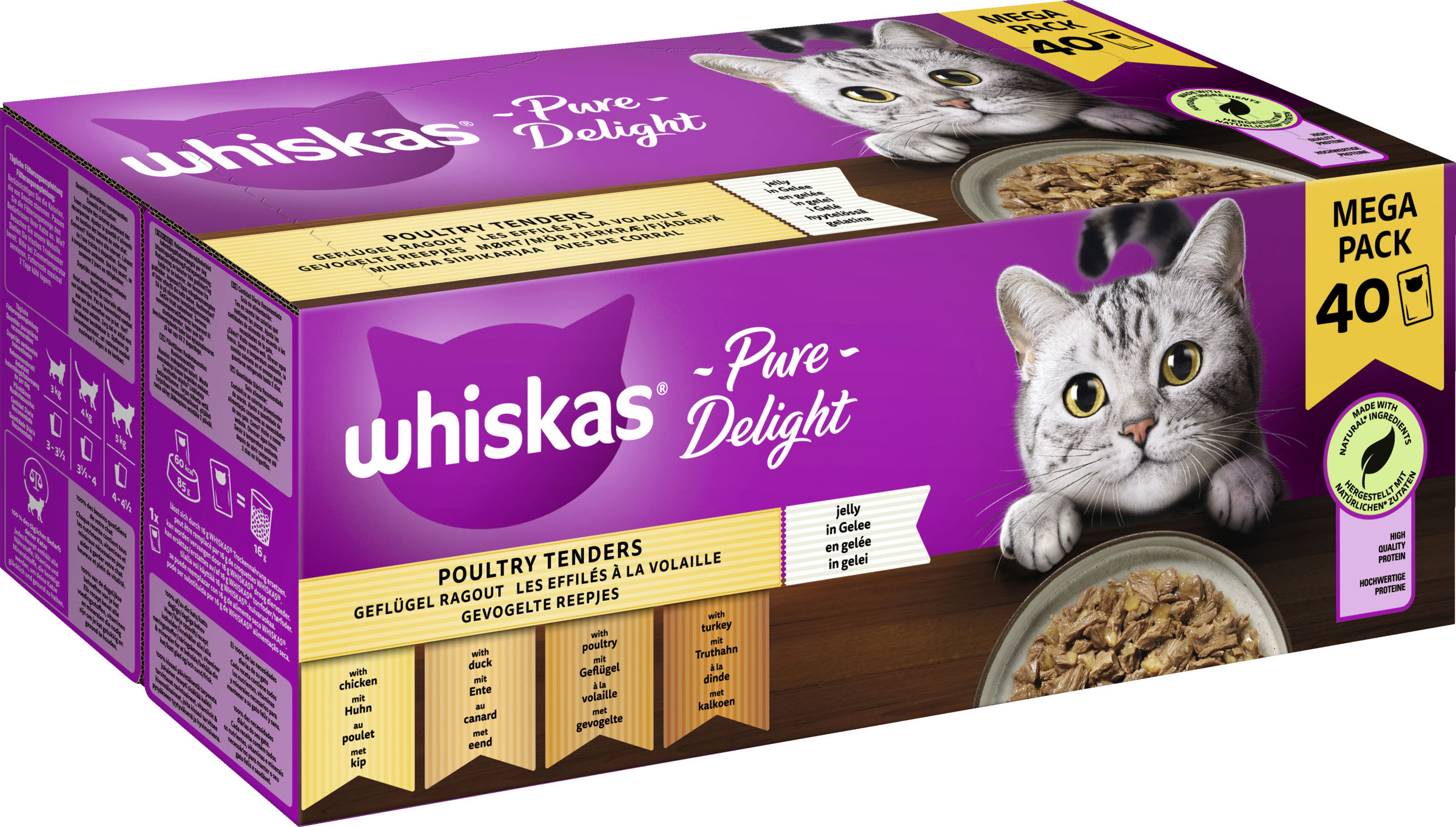 Adult-Katzenfutter in Gelee, das auf die Bedürfnisse deiner ausgewachsenen Katze abgestimmt ist. Köstlicher Katzenfutter-Mix. In 85g-Beuteln. Jedes köstliche Stückchen wird im eigenen Saft gegart, um die köstliche natürliche Flüssigkeit einzuschließen, dann gedämpft und ruhen gelassen, um saftige, zarte Stücke zu erhalten, die deine Katze vor Aufregung schnurren lassen. Hergestellt mit natürlichen* Zutaten und hochwertigem Protein, ohne künstliche Farb- und Konservierungsstoffe für puren, leckeren Genuss.