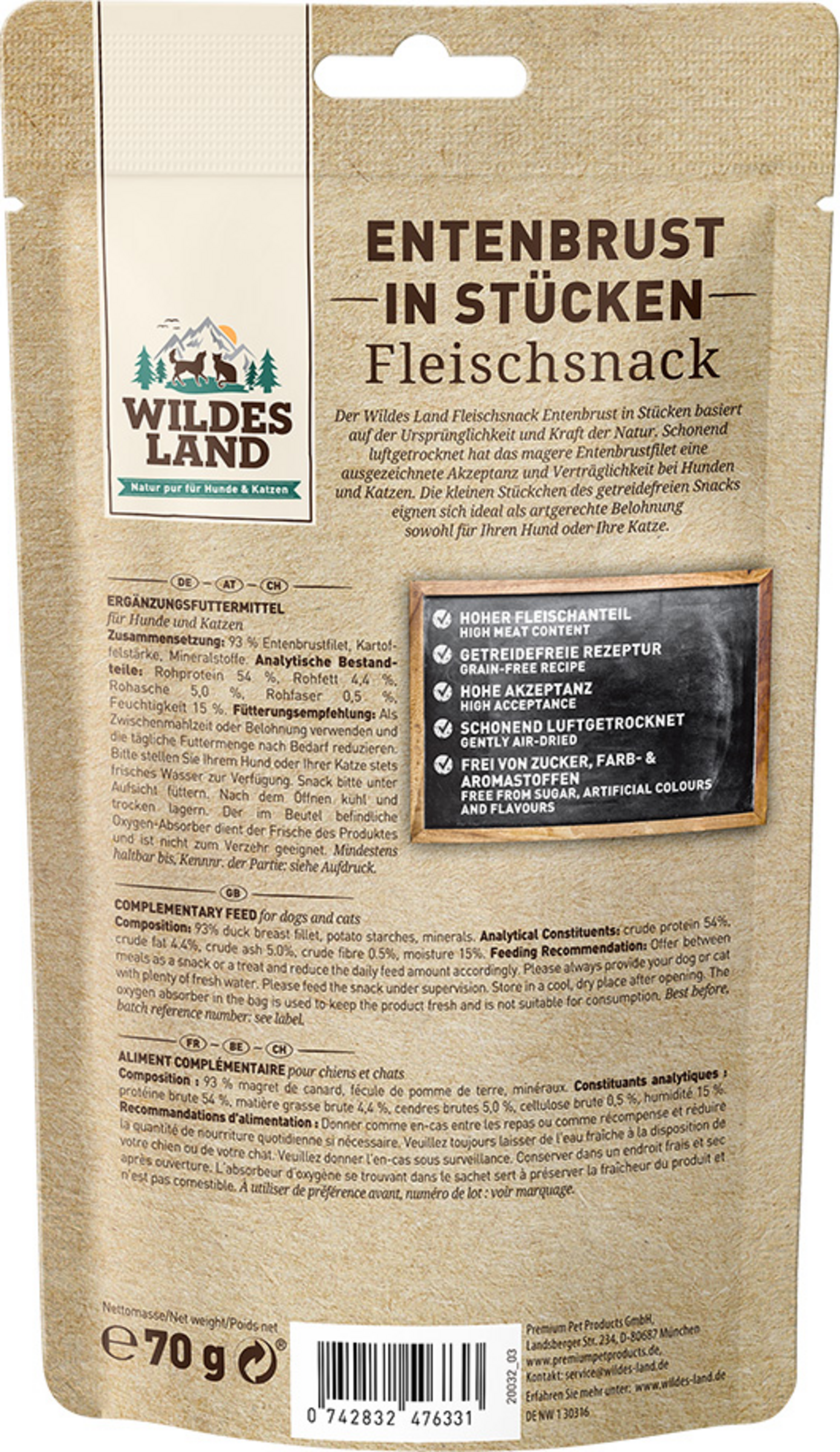 Entenbrustfilet 93%, Kartoffelstärke, Mineralstoffe.