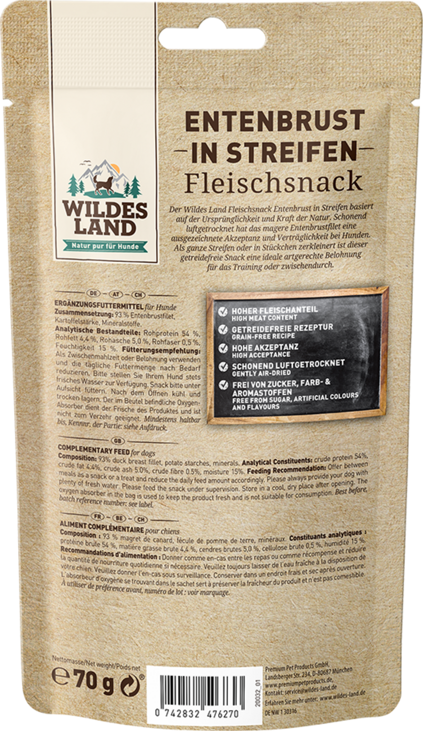 Der Wildes Land Fleischsnack Entenbrust in Streifen basiert auf der Ursprünglichkeit und Kraft der Natur. Schonend luftgetrocknet hat das magere Entenbrustfilet eine eine ausgezeichnete Akzeptanz und Verträglichkeit bei Hunden. Als ganze Streifen oder in Stückchen zerkleinert ist dieser getreidefreie Snack eine ideale artgerechte Belohnung für das Training oder zwischendurch und gibt Ihnen die Möglichkeit, die innige Beziehung zwischen Mensch und Tier weiter zu stärken.