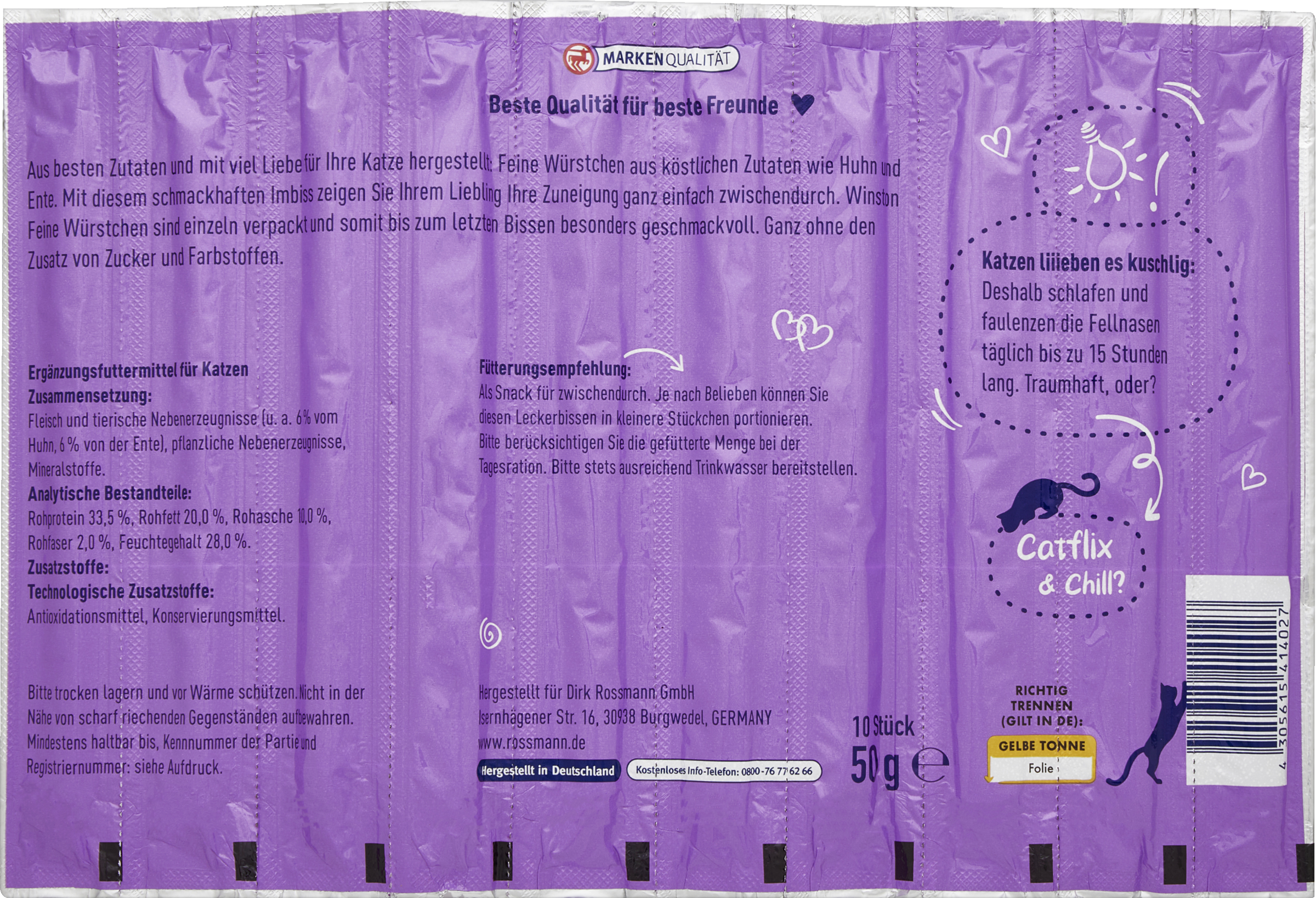Aus besten Zutaten und mit viel Liebe hergestellt: Feine Würstchen für Ihre Katze aus Sie köstlichen Zutaten wie Hähnchen und Ente. Mit diesem schmackhaften Imbiss zeigen chen sind Ihrem Liebling Ihre Zuneigung ganz einfach zwischendurch. Winston Feine Würst einzeln verpackt und daher bis zum letzten Bissen besonders geschmackvoll. Ganz ohne den Zusatz von Zucker und Farbstoffen. Aus Überzeugung Qualität. Aus Liebe Winston.