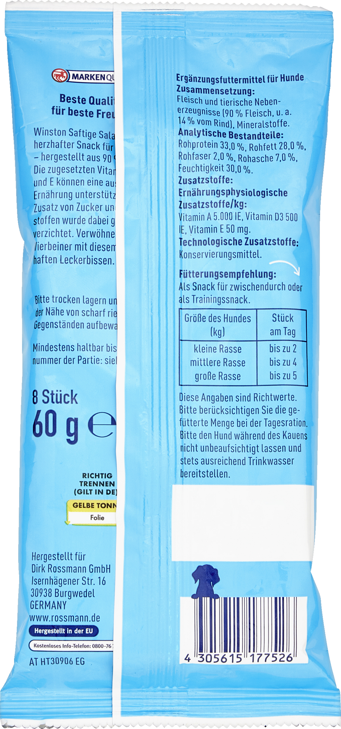 Aus gutem Grund gibt’s diese Extrawurst für Ihren Hund: als herzhafte Belohnung für zwischendurch oder während des Trainings. Winston Saftige Salami sind ein herzhafter und schmackhafter Leckerbissen für Ihren Hund – hergestellt aus 90% Fleisch. Auf den Zusatz von Zucker und Farbstoffen wird dabei ganz bewusst verzichtet. Die zugesetzten Vitamine A, D3 und E können eine ausgeglichene Ernährung unterstützen. Winston Saftige Salami wurden nach neuesten Erkenntnissen speziell auf die Ernährungsbedürfnisse Ihres Lieblings abgestimmt. Hergestellt aus ausgesuchten Rohstoffen enthalten sie wichtige Nähr- und Aufbaustoffe. Aus Überzeugung Qualität. Aus Liebe Winston.