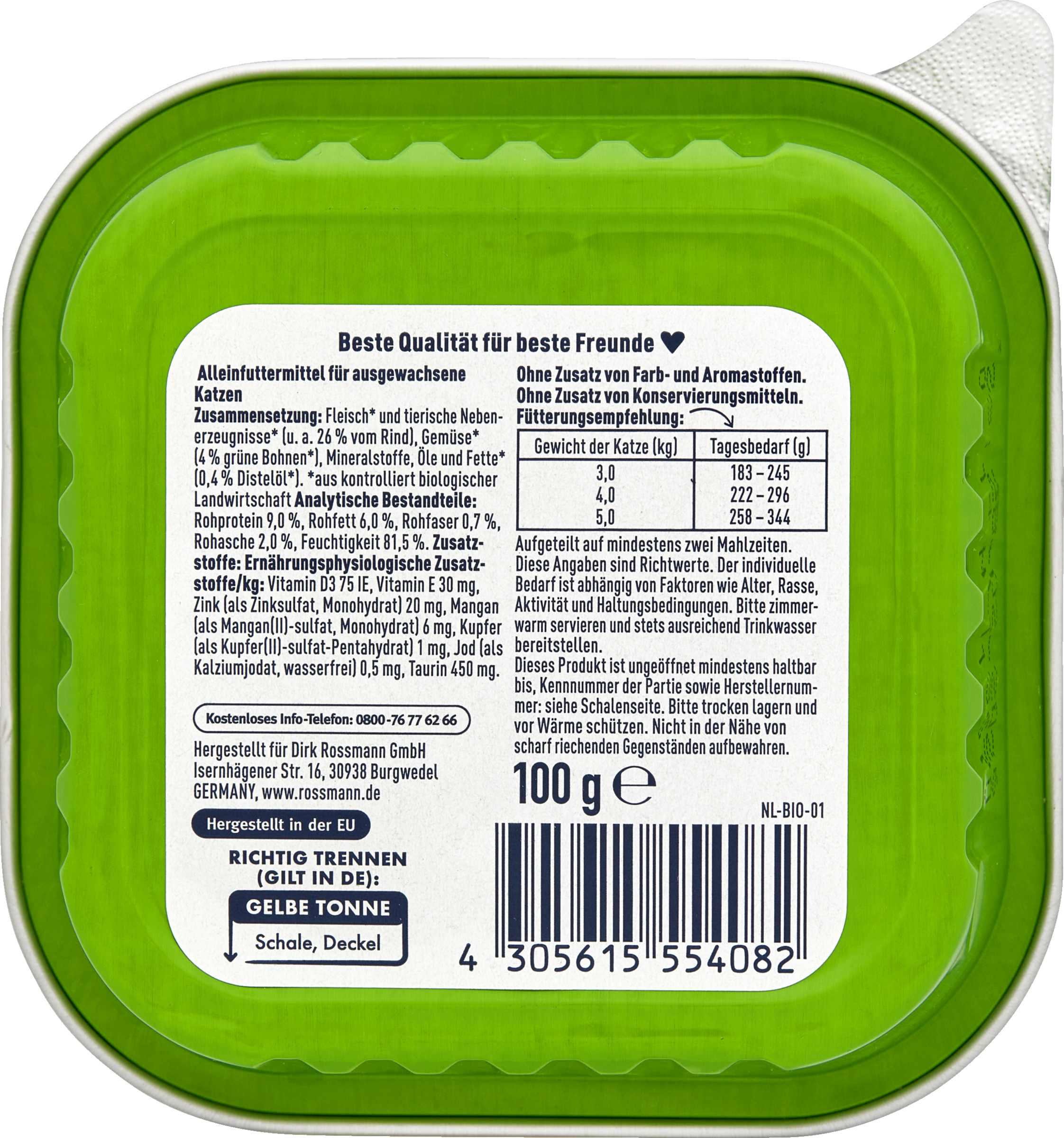 Eine ausgewachsene, durchschnittlich große Katze (ca. 4 kg) benötigt 1 Schale pro Mahlzeit, ca. 3 Schalen am Tag.Diese Angaben sind Richtwerte: Der individuelle Bedarf hängt von weiteren Faktoren wie Alter, Rasse, Aktivität und Haltungsbedingungen ab. Bitte zimmerwarm servieren und stets frisches Trinkwasser bereitstellen.