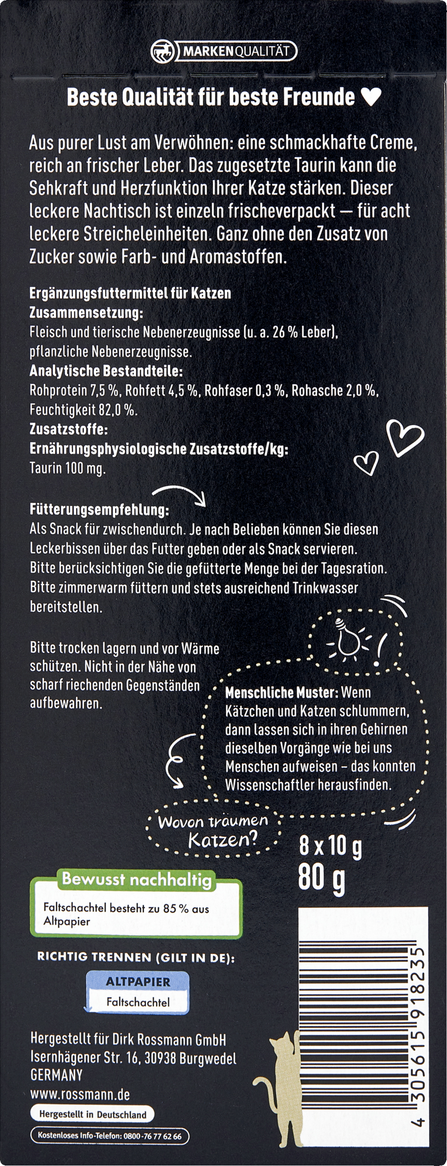 Aus purer Lust am Verwöhnen: eine schmackhafte Creme, reich an frischer Leber. Das zugesetzte Taurin kann die Sehkraft und Herzfunktion Ihres Lieblings stärken. Dieser leckere Nachtisch ist einzeln frischeverpackt - für acht leckere Streicheleinheiten. Ganz ohne den Zusatz von Zucker sowie Farb- und Aromastoffen.