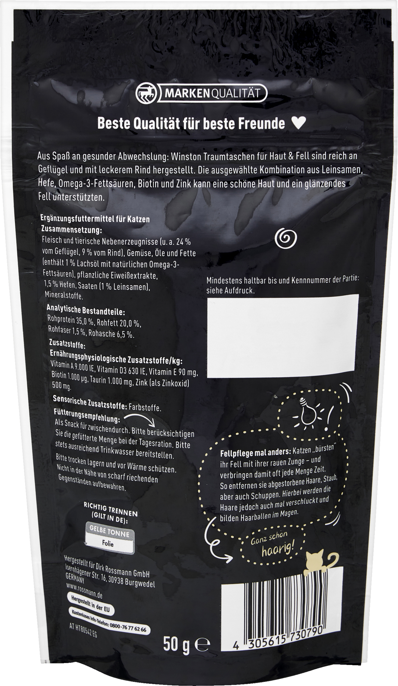 Aus Spaß an gesunder Abwechslung ohne Zusatz von Getreide und Zucker. Winston Traumtaschen für Haut & Fell sind reich an Geflügel und mit leckerem Rind hergestellt. Die ausgewählte Kombination aus Leinsamen, Hefe, Omega-3-Fettsäuren, Biotin und Zink können eine schöne Haut und ein glänzendes Fell unterstützen. Winston Traumtaschen für Haut & Fell wurden nach neuesten Erkenntnissen speziell auf die Ernährungsbedürfnisse Ihrer Katze abgestimmt. Hergestellt aus ausgesuchten Rohstoffen enthalten sie wichtige Nähr- und Aufbaustoffe. Aus Überzeugung Qualität. Aus Liebe Winston.
