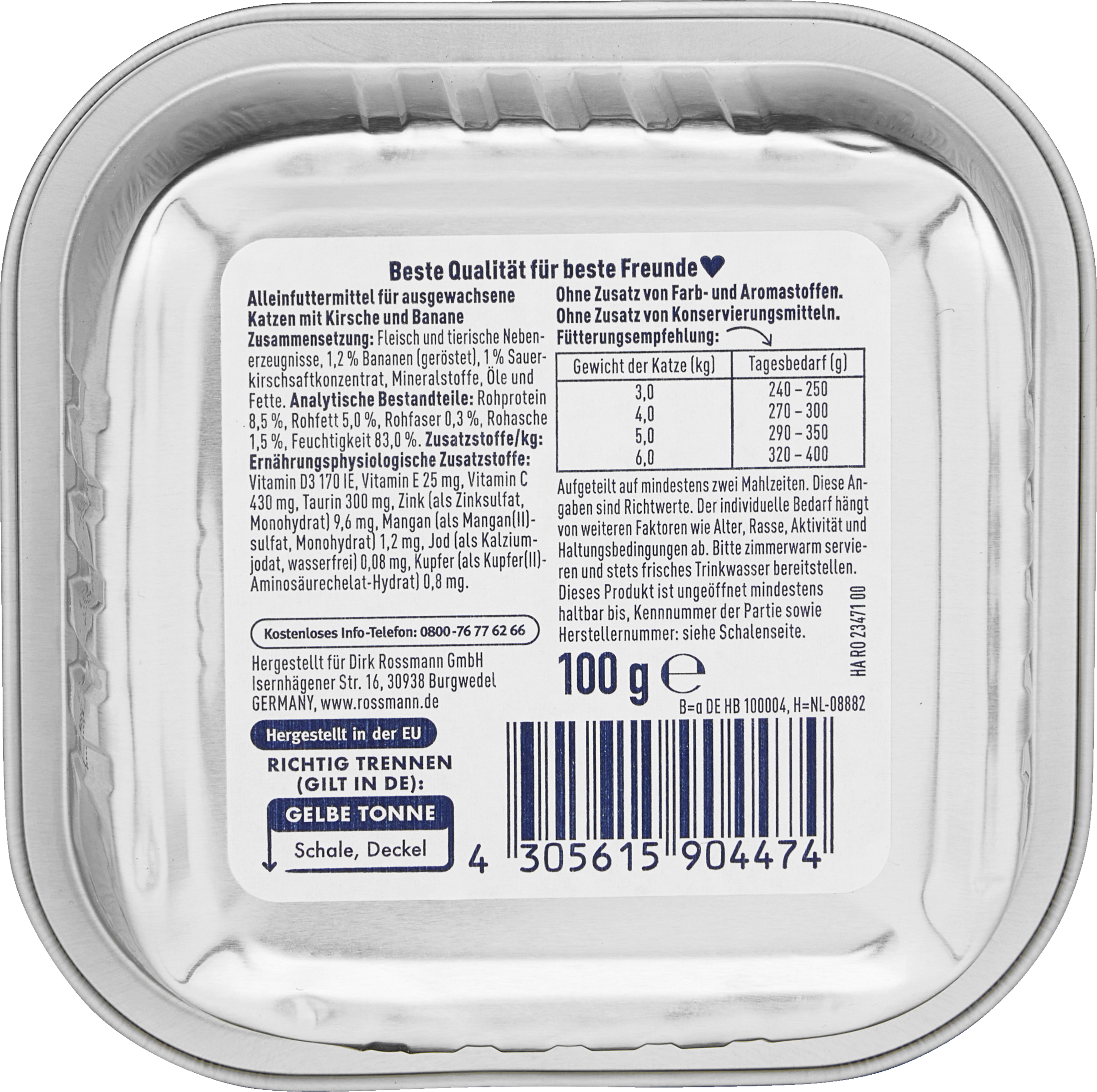 Zusammensetzung: Fleisch und tierische Nebenerzeugnisse, 1,2% Bananen (geröstet), 1% Sauerkirschsaftkonzentrat, Mineralstoffe, Öle und Fette.
