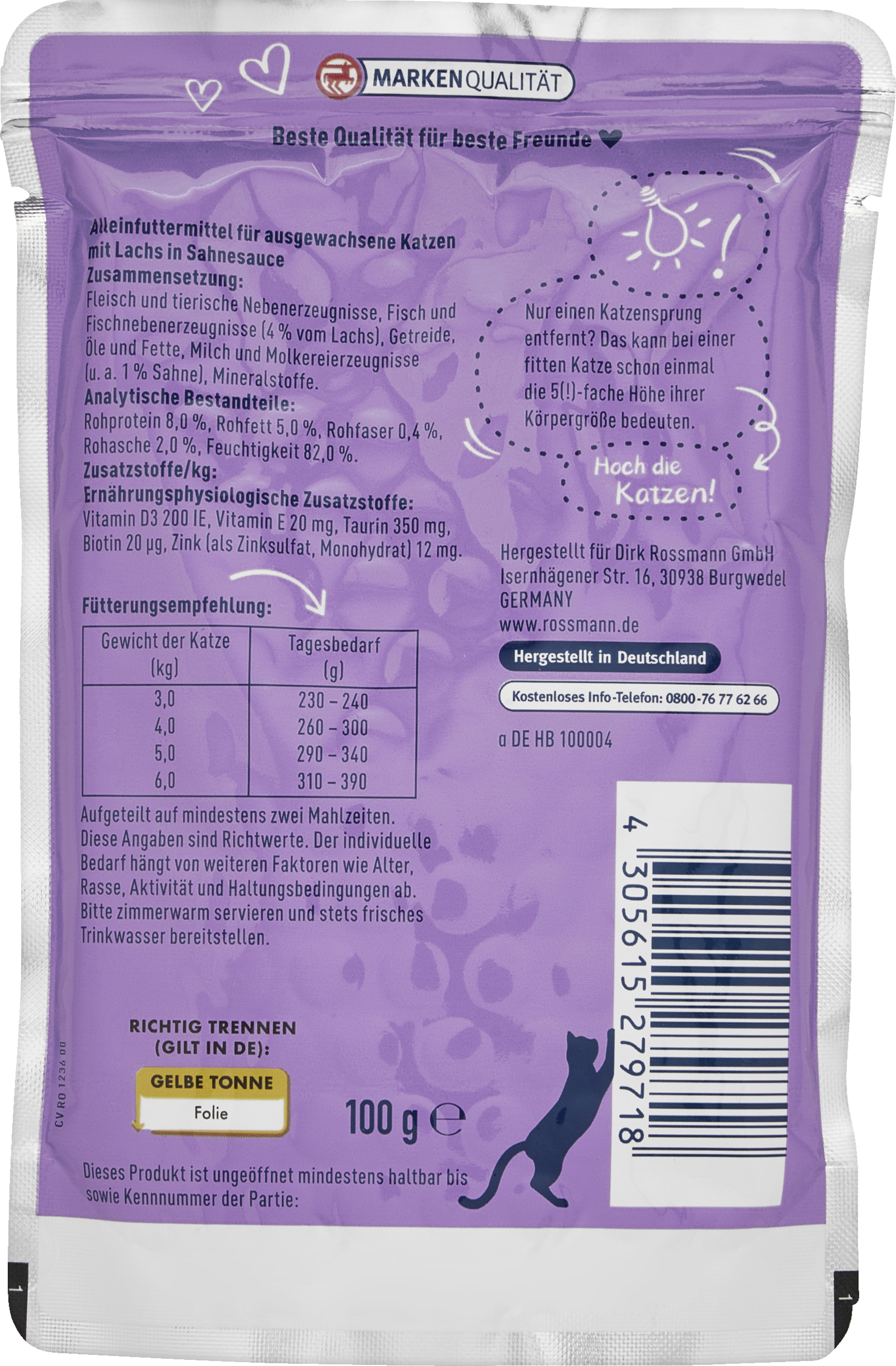 Eine ausgewachsene, durchschnittlich große Katze (ca. 4 kg) benötigt 270-300 g pro Tag, aufgeteilt auf mehrere Mahlzeiten. Diese Angaben sind Richtwerte: Der individuelle Bedarf hängt von weiteren Faktoren wie Alter, Rasse, Aktivität und Haltungsbedingungen ab. Bitte zimmerwarm servieren und stets frisches Trinkwasser bereitstellen.