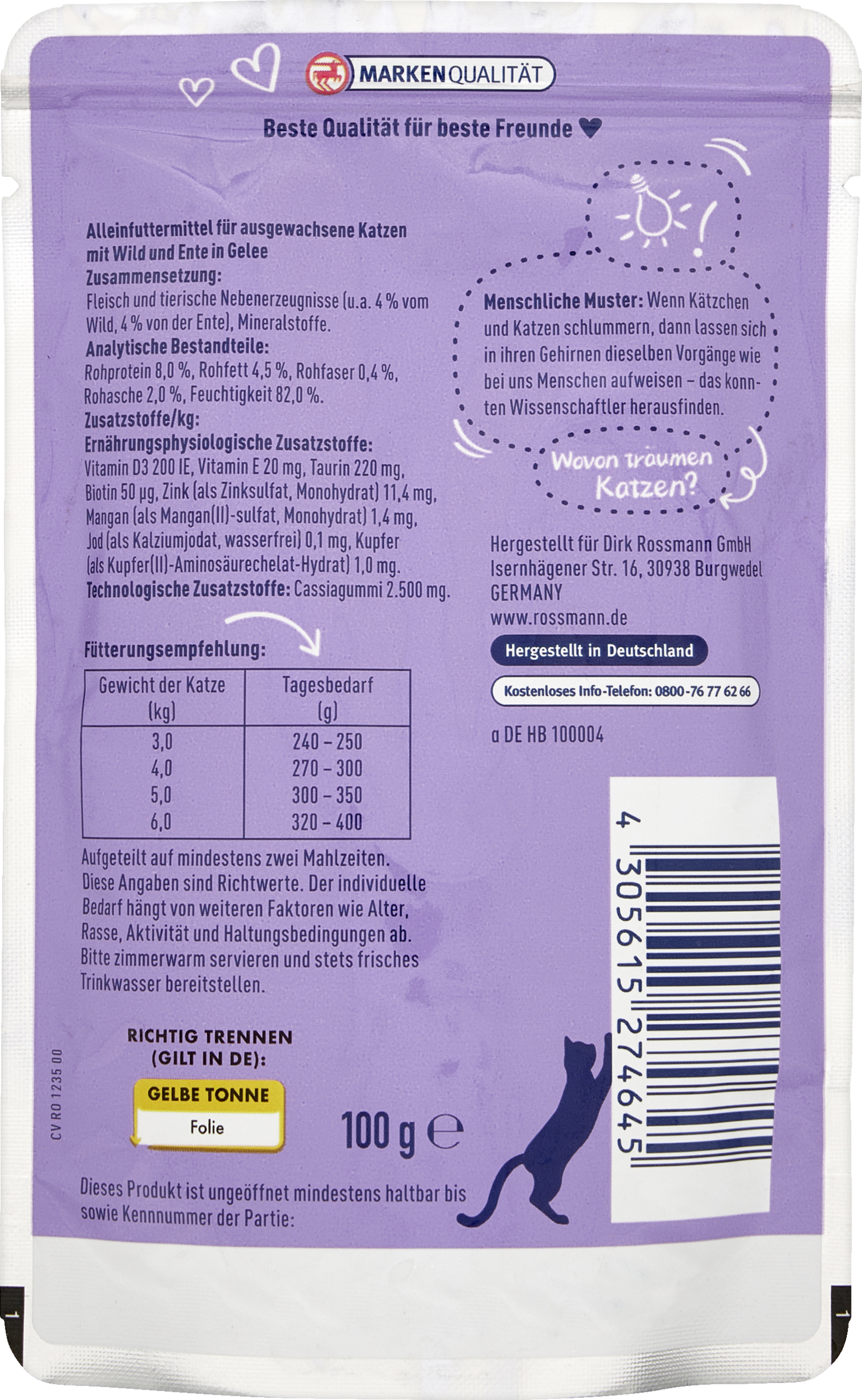 Aufgeteilt auf mindestens zwei Mahlzeiten. Diese Angaben sind Richtwerte. Der individuelle Bedarf hängt von weiteren Faktoren wie Alter, Rasse, Aktivität und Haltungsbedingungen ab. Bitte zimmerwarm servieren und stets frisches Trinkwasser bereitstellen.