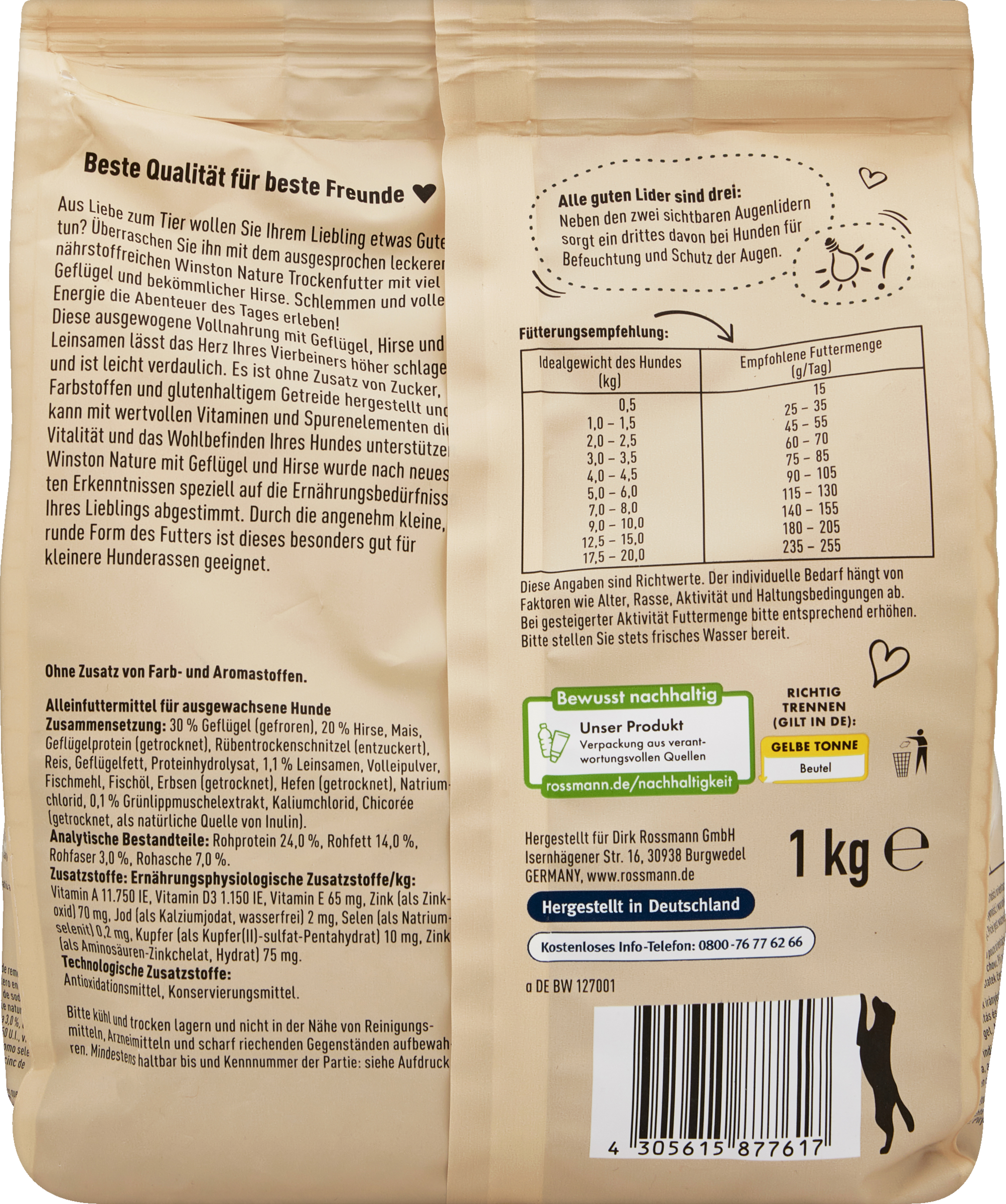 Aus Liebe zum Tier wollen Sie Ihrem Liebling etwas Gutes tun? Überraschen Sie ihn mit dem ausgesprochen leckeren, nährstoffreichen Winston Nature Trockenfutter mit extra viel frischem Geflügel und bekömmlicher Hirse.Schlemmen und voller Energie die Abenteuer des Tages erleben! Diese ausgewogene Vollnahrung mit Geflügel, Hirse und Leinsamen lässt das Herz Ihres Vierbeiners höher schlagen und ist leicht verdaulich.