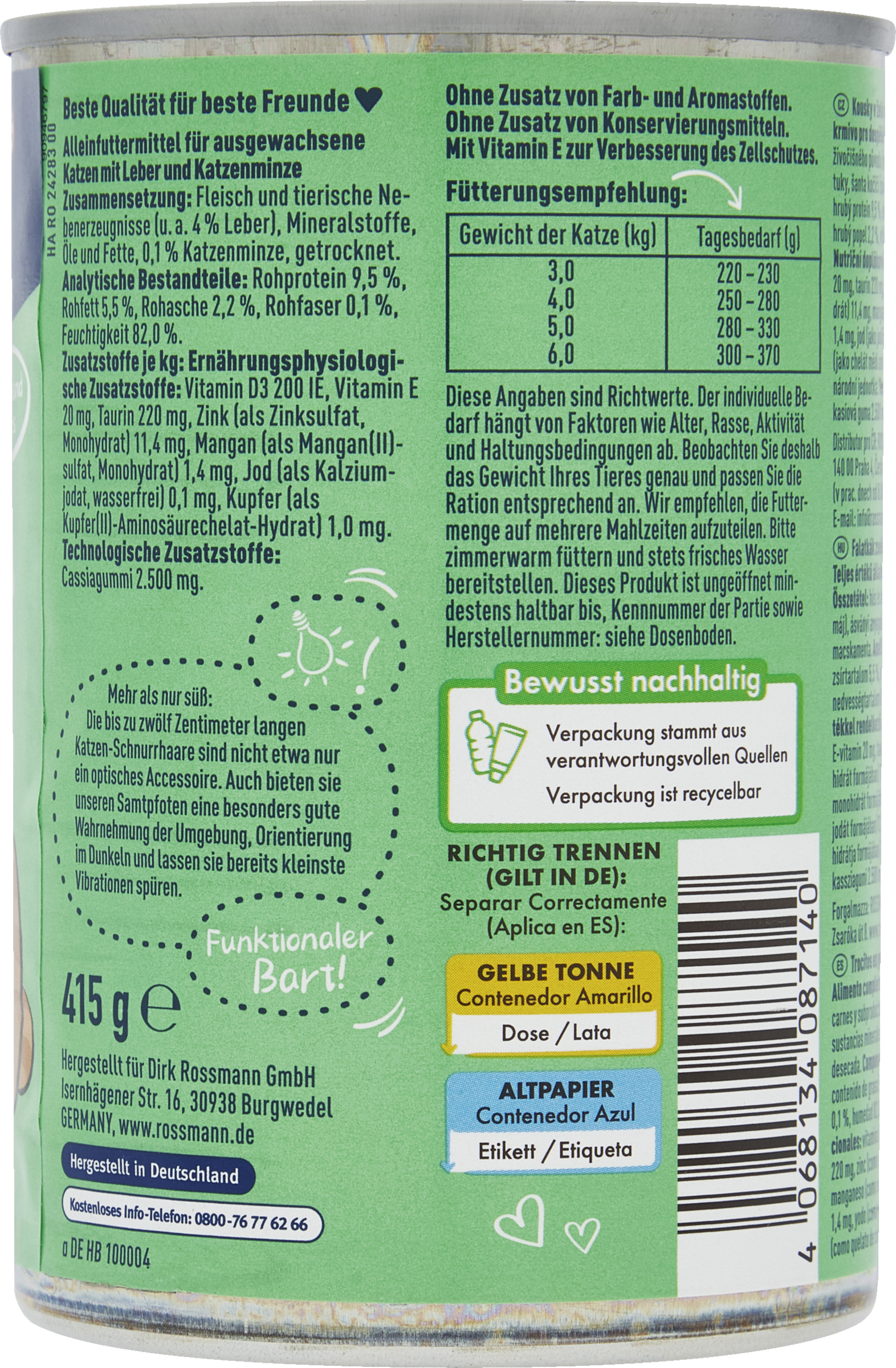 Diese Angaben sind Richtwerte. Der individuelle Bedarf hängt von weiteren Faktoren wie Alter, Rasse, Aktivität und Haltungsbedingungen ab. Bitte zimmerwarm servieren und stets frisches Trinkwasser bereitstellen.