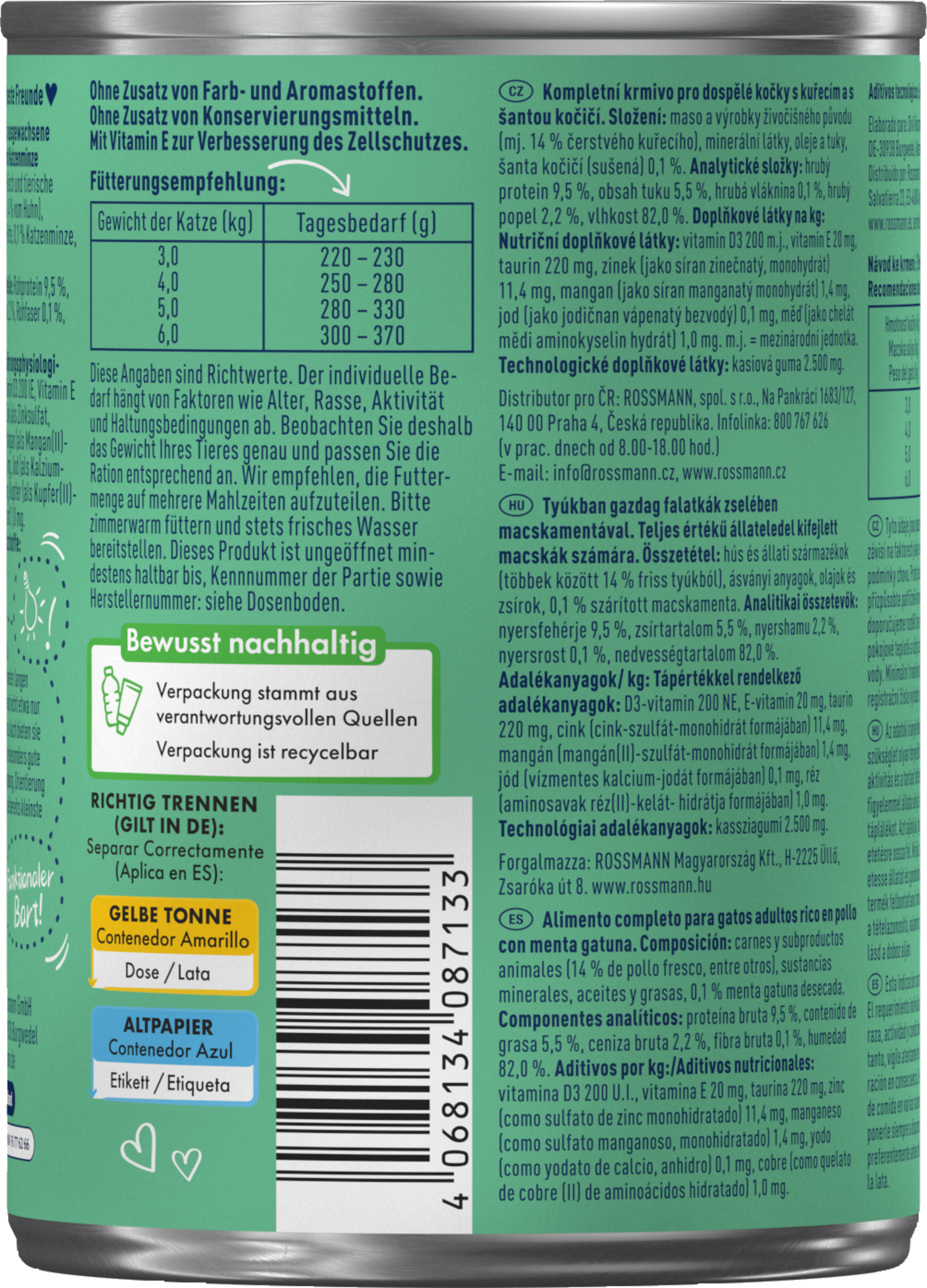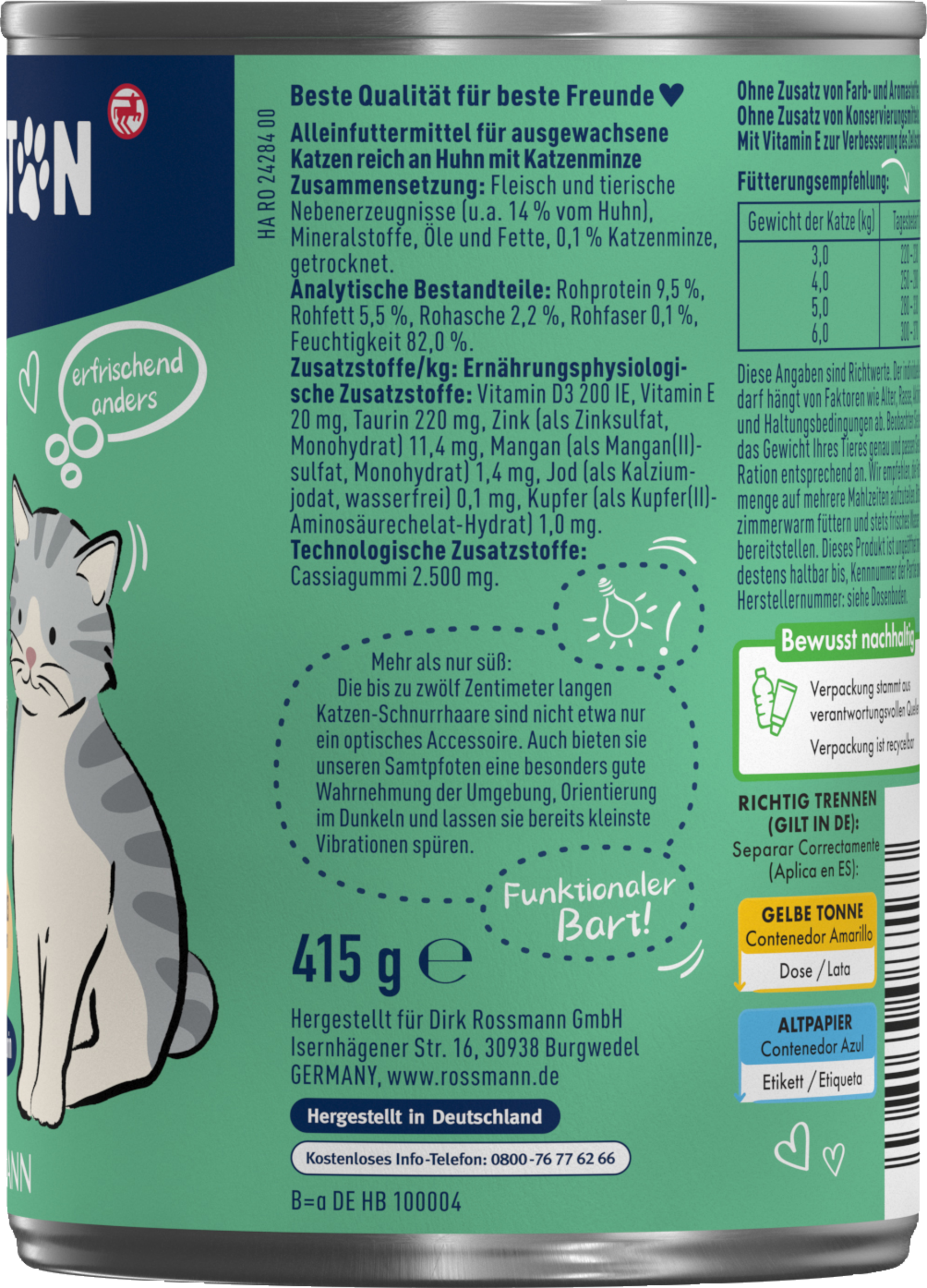 Diese Angaben sind Richtwerte. Der individuelle Bedarf hängt von weiteren Faktoren wie Alter, Rasse, Aktivität und Haltungsbedingungen ab. Bitte zimmerwarm servieren und stets frisches Trinkwasser bereitstellen.