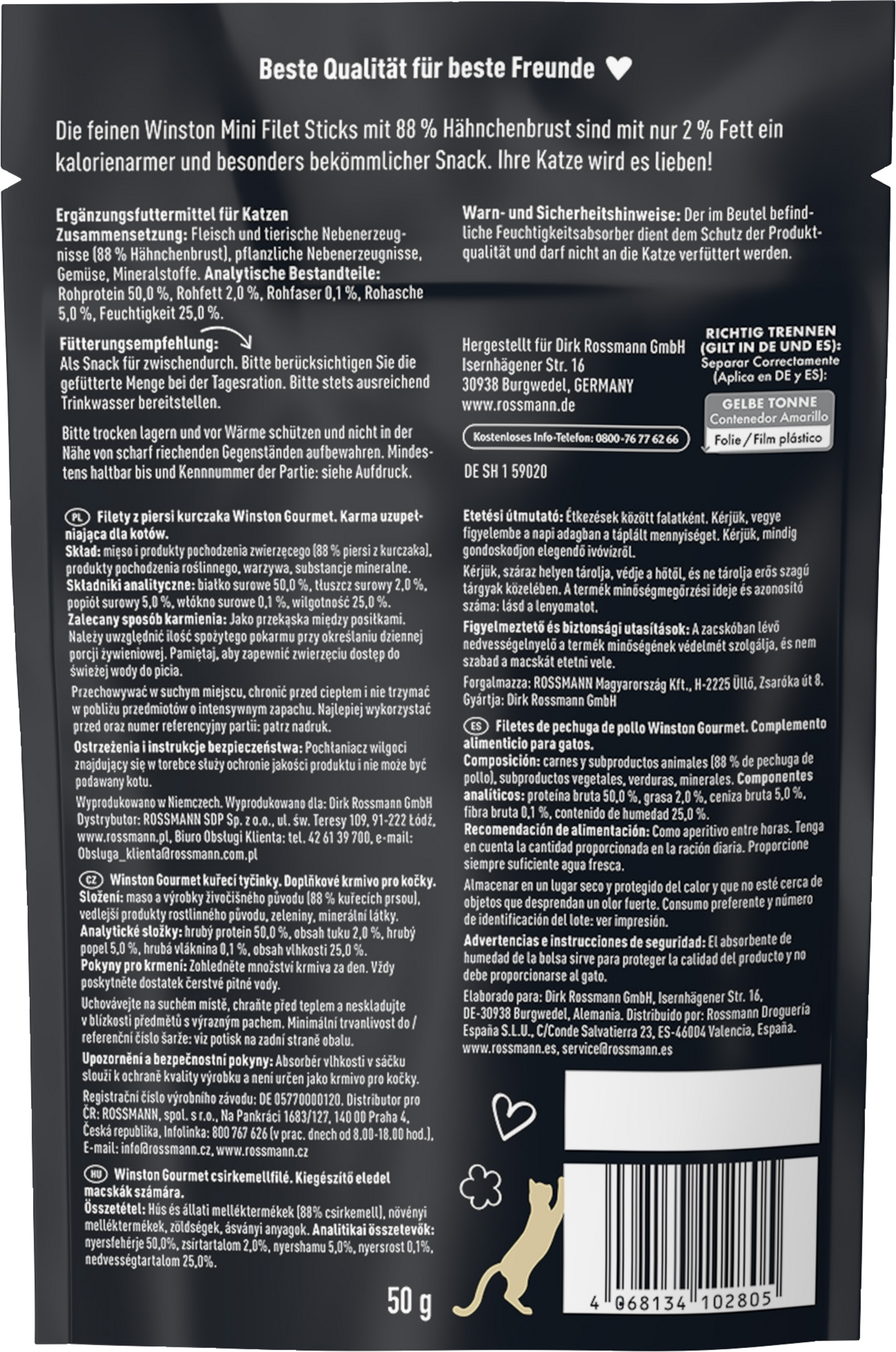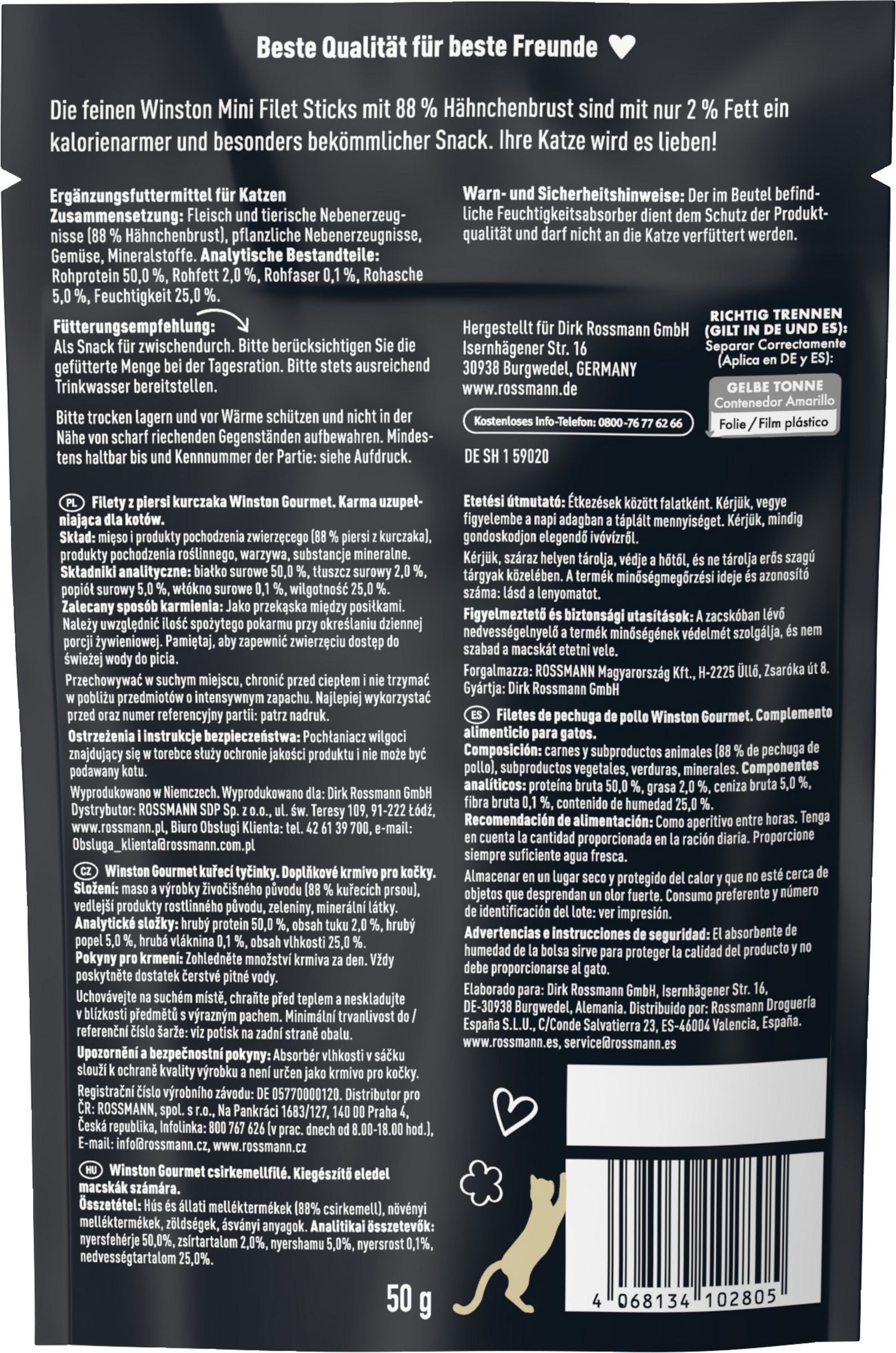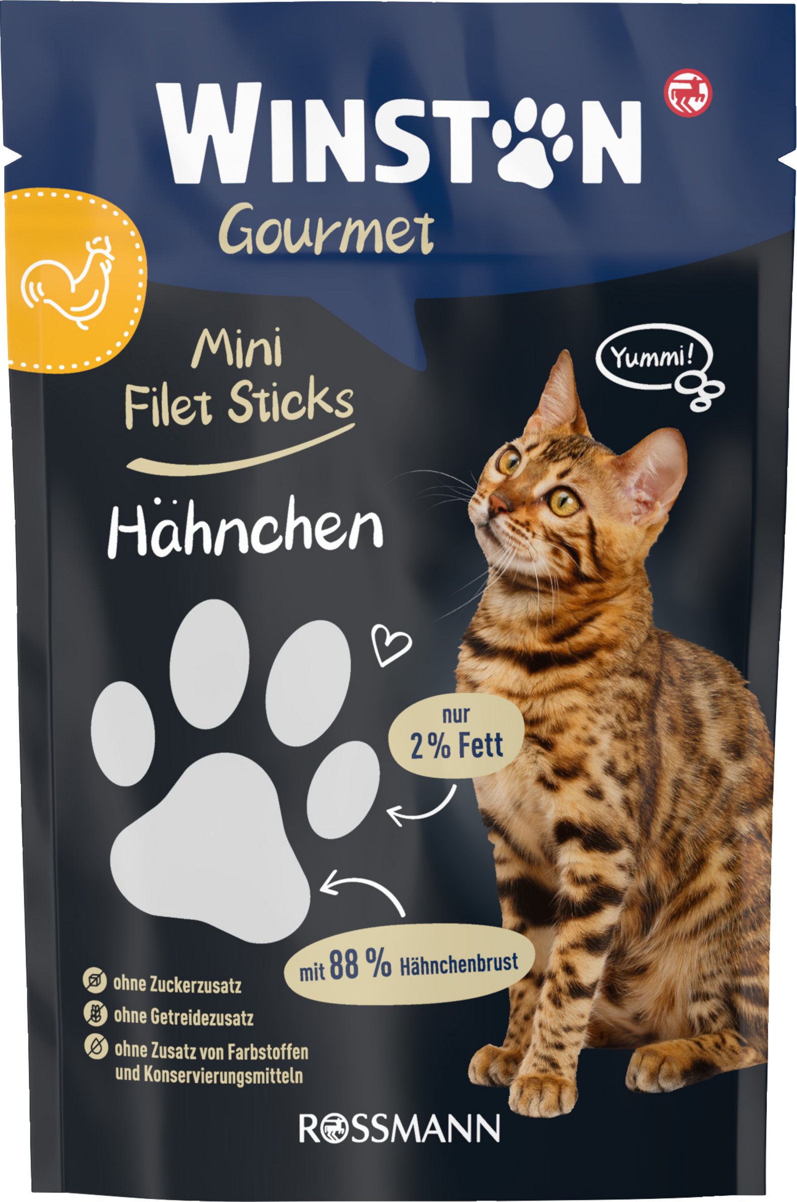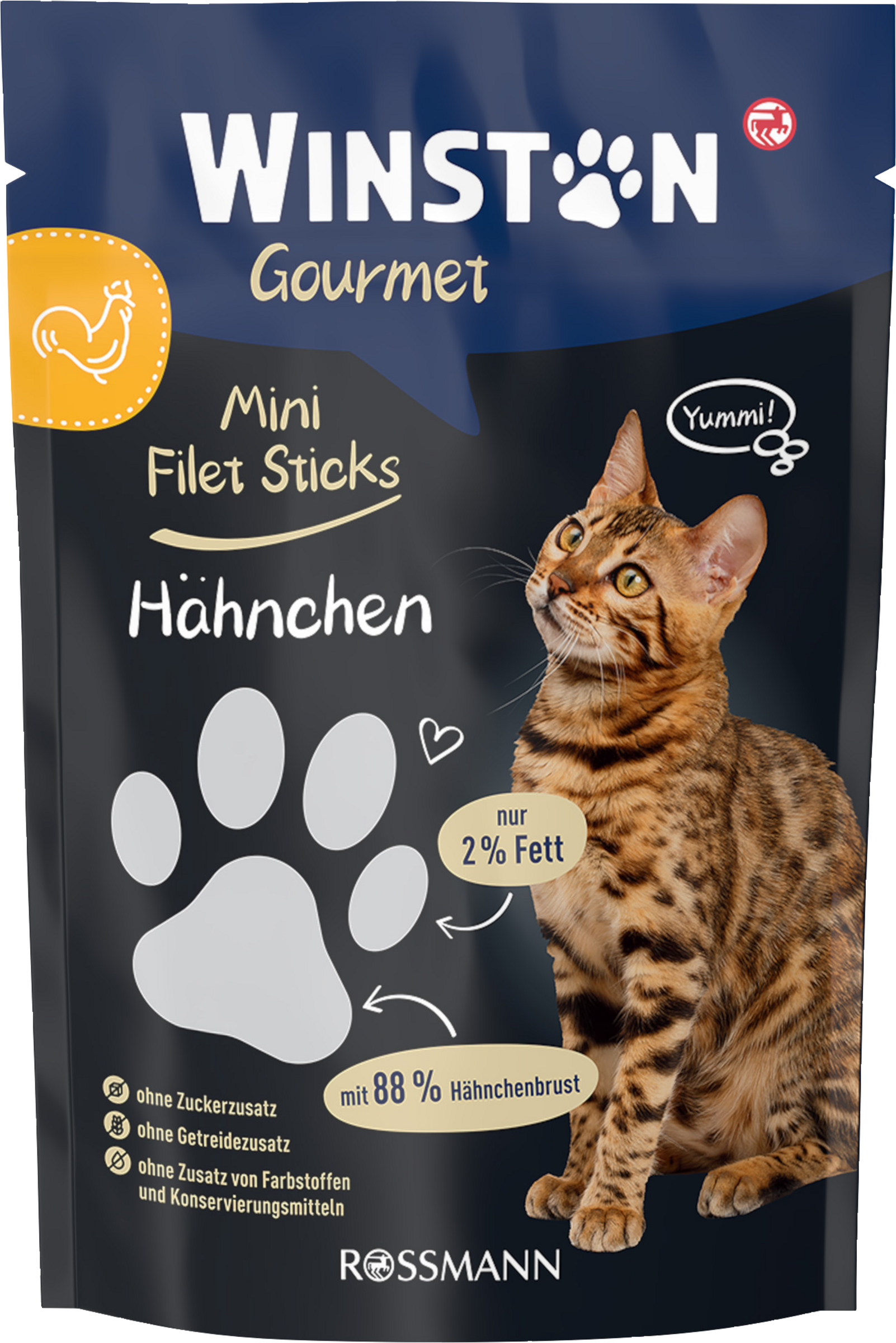 Die feinen Winston Mini Filet Sticks mit 88% Hähnchenbrust sind mit nur 2% Fett ein kalorienarmer und besonders bekömmlicher Snack. Ihre Katze wird es lieben!