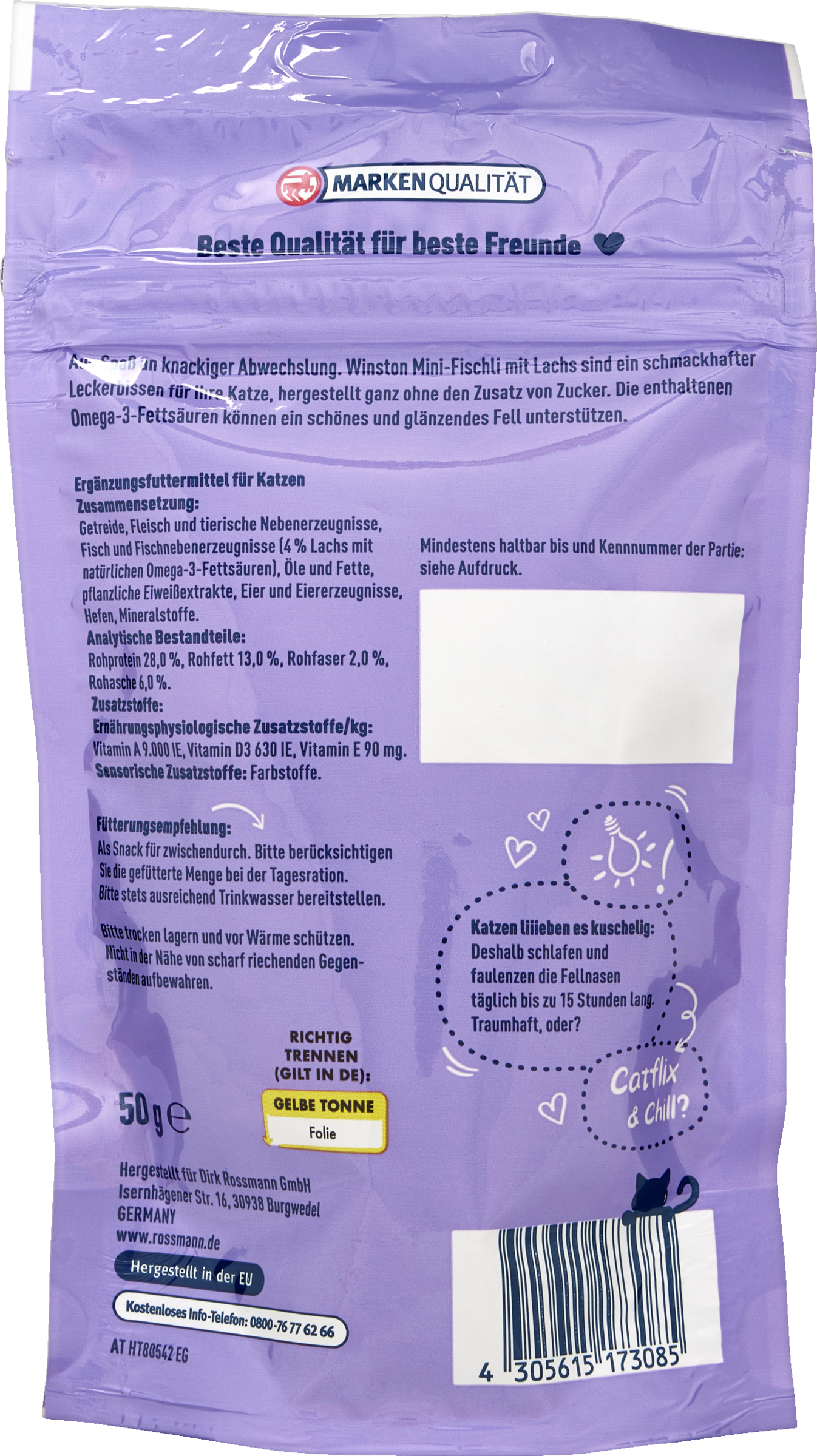 Winston Mini-Fischli sind ein knuspriger Knabberspaß für Ihre Katze, ohne Zuckerzusatz hergestellt und speziell auf die Ernährungsbedürfnisse Ihres Lieblings abgestimmt. Sorgfältig ausgewählte Zutaten sowie der leckere Lachs stellen für Ihre Katze einen unwiderstehlichen Leckerbissen dar. Die im Fischöl enthaltenen Omega-3-Fettsäuren können ein gesundes und glänzendes Fell unterstützen.