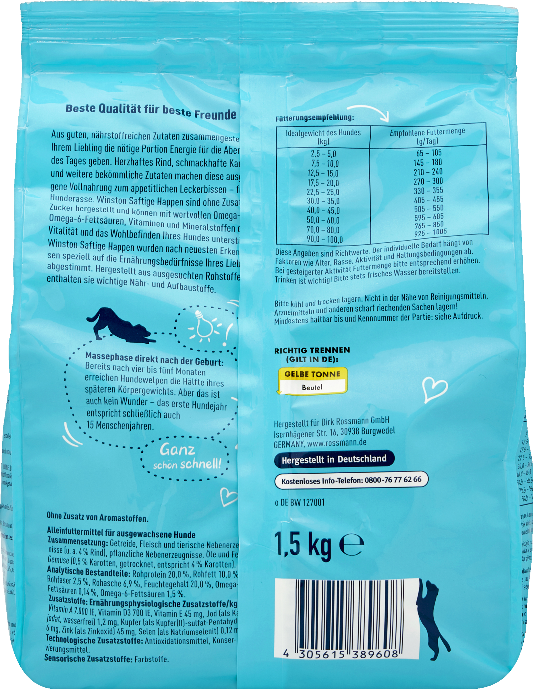 Aus guten, nährstoffreichen Zutaten zusammengestellt, die Ihrem Liebling die nötige Portion Energie für die Abenteuer des Tages geben. Herzhaftes Rind, schmackhafte Karotten und Getreide machen diese ausgewogene Vollnahrung zum appetitlichen Leckerbissen – für jede Hunderasse. Winston Saftige Happen sind ohne Zusatz von Zucker hergestellt und können mit wertvollen Omega-3- & -6-Fettsäuren, Vitaminen und Mineralstoffen die Vitalität und das Wohlbefinden Ihres Hundes unterstützen. Winston Saftige Happen wurden nach neuesten Erkenntnissen speziell auf die Ernährungsbedürfnisse Ihres Lieblings abgestimmt. Hergestellt aus ausgesuchten Rohstoffen enthalten sie wichtige Nähr- und Aufbaustoffe. Aus Überzeugung Qualität. Aus Liebe Winston.