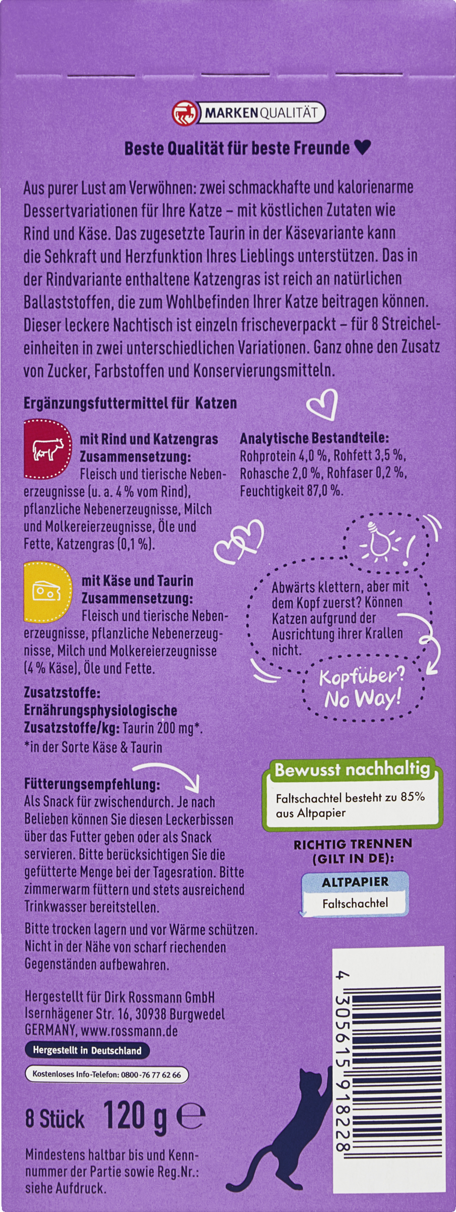 Aus purer Lust am Verwöhnen: zwei schmackhafte und kalorienarme Dessertvariationen für Ihre Katze - aus köstlichen Zutaten wie Rind und Käse. Das zugesetzte Taurin in der Käsevariante kann die Sehkraft und Herzfunktion Ihres Lieblings stärken. Das in der Rindvariante enthaltene Katzengras ist reich an natürlichen Ballaststoffen, die zum Wohlbefinden Ihrer Katze beitragen können. Dieser leckere Nachtisch ist einzeln frischeverpackt - für 8 Streicheleinheiten in zwei unterschiedlichen Variationen. Ganz ohne den Zusatz von Zucker, Farbstoffen und Konservierungsmitteln.