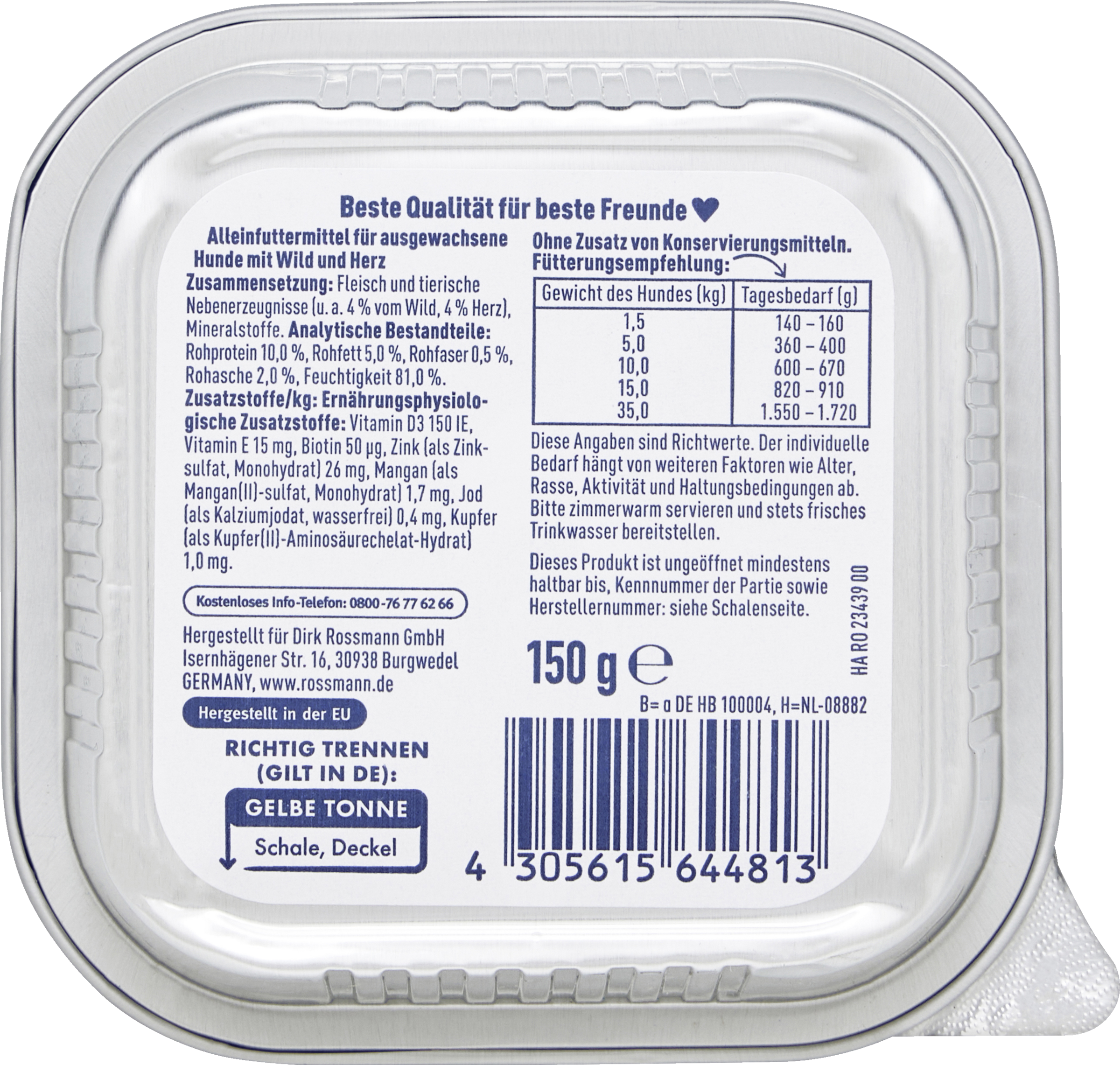 Diese Angaben sind Richtwerte. Der individuelle Bedarf hängt von weiteren Faktoren wie Alter, Rasse, Aktivität und Haltungsbedingungen ab. Bitte zimmerwarm servieren und stets frisches Trinkwasser bereitstellen