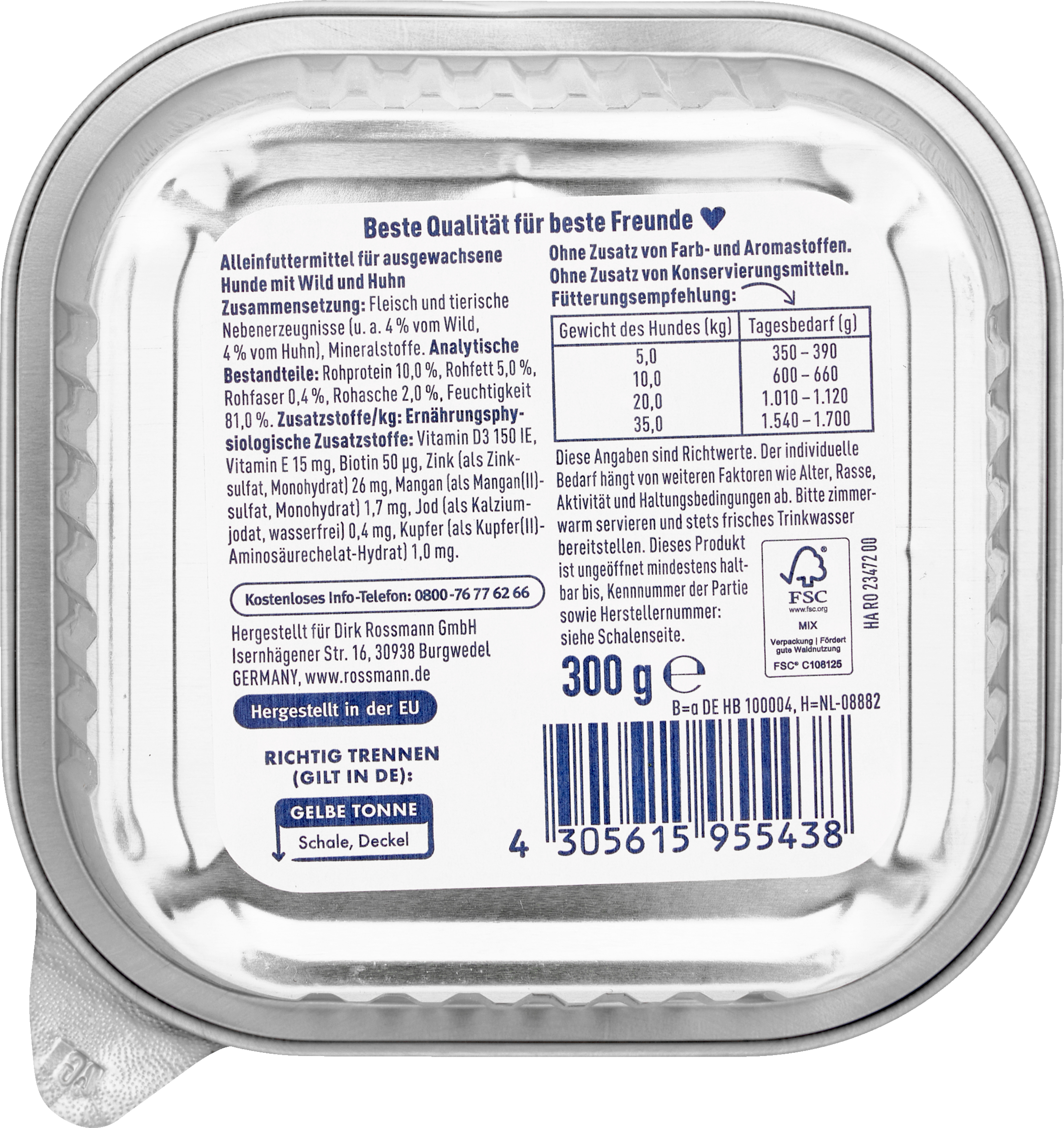 Fleisch und tierische Nebenerzeugnisse (u. a. 4% vom Wild, 4% vom Huhn), Mineralstoffe.