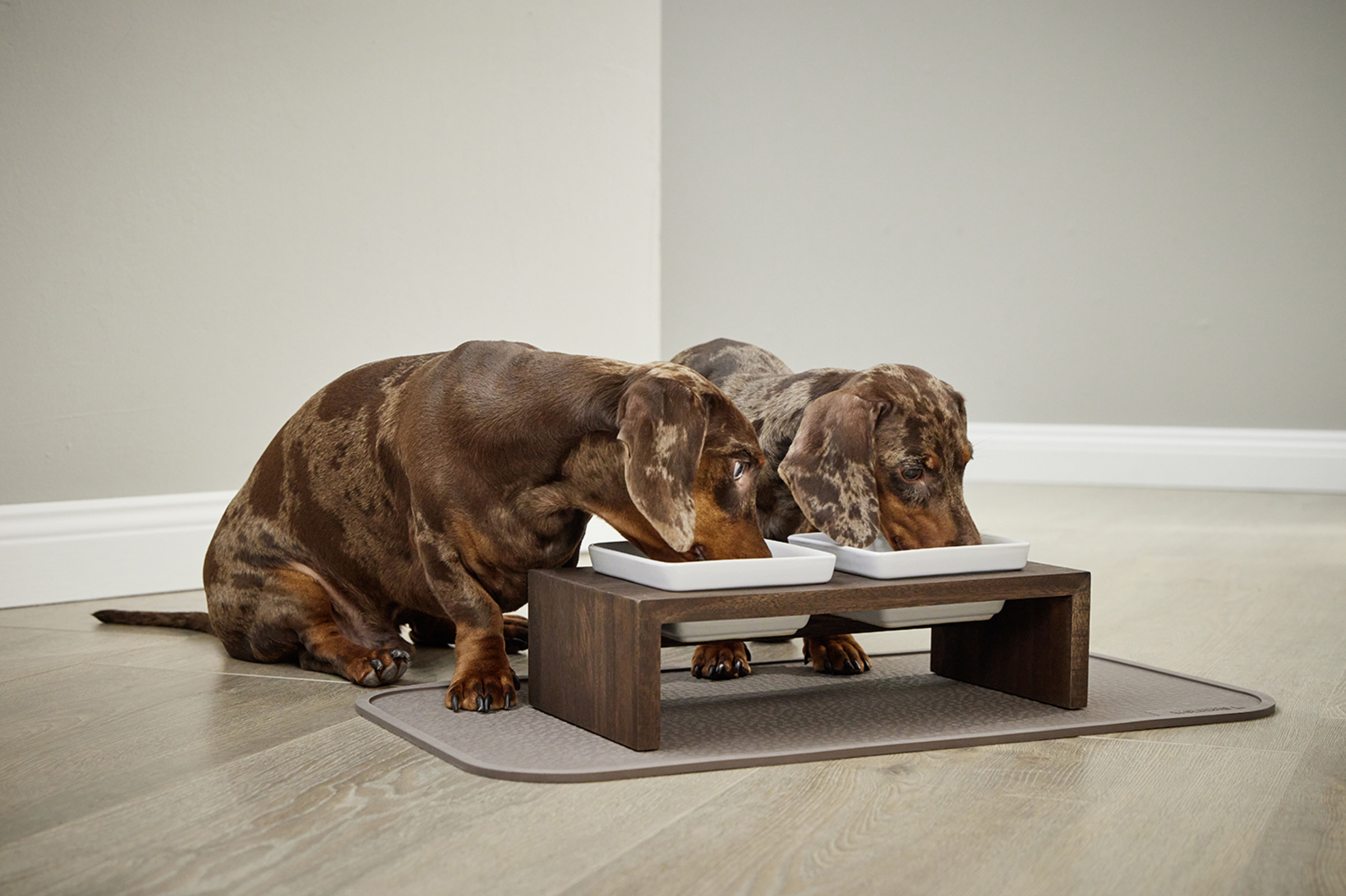 Die Farbgebung des Holzes entsteht durch einen Anstrich aus Öl, zum Wohl von Tier und Umwelt wird auf chemische Lacke verzichtet. Die eckigen, herausnehmbaren Näpfe sind aus 100% Keramik gefertigt und lassen sich in der Spülmaschine reinigen. Kleine Silikonpunkte an der Unterseite bieten einen festen Halt, so steht die Futterstation stabil und verrutscht nicht. Sie eignet sich optimal für Wasser-, Nass- oder Trockenfutter.